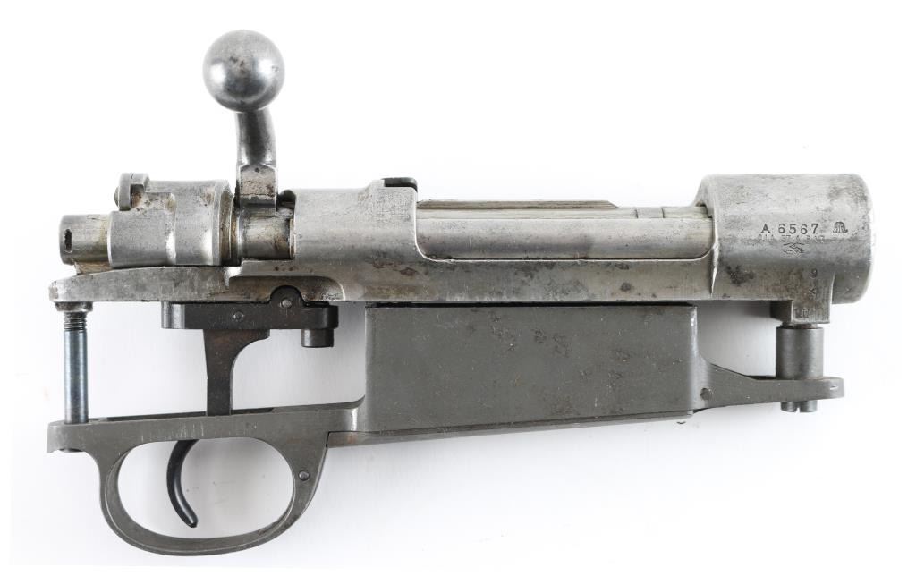 Large ring 1898 Mauser (action only) in overall good condition, mismatched, no barrel, no stock or other fittings. Action appears complete, with turned down bolt handle. Bare metal receiver and bolt, blued bottom metal with hinged floorplate. Some patina, very little pitting. Importer marked "CIA ST ALB VT" on right side of receiver ring. Condition is NRA Good++ (Action only) *** C&R Firearm ***