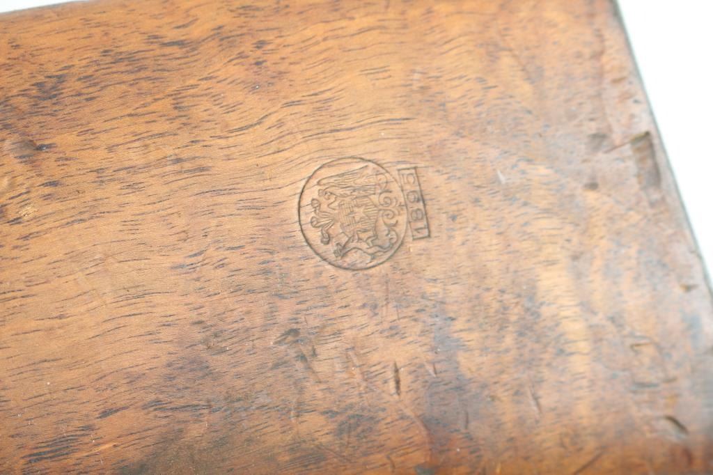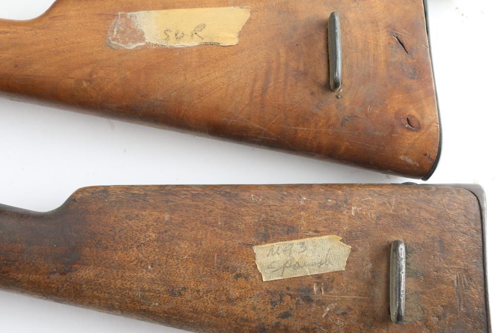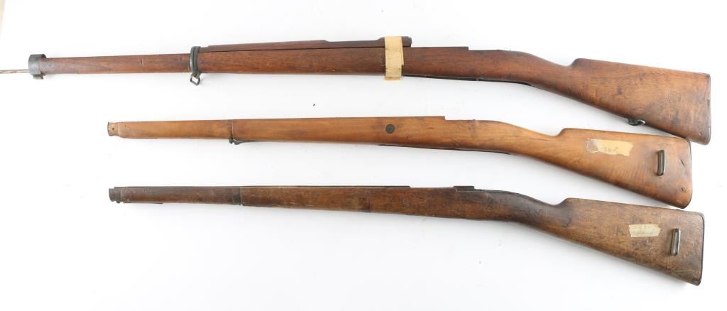 uncut, straight wristed, fit Mauser 93, 95. Would fit Swedish 96 but these do not have the butt disks. Two for approx 24" barrels (have been sanded), one for approx 29" barrel (with handguard and bands, does not look sanded).