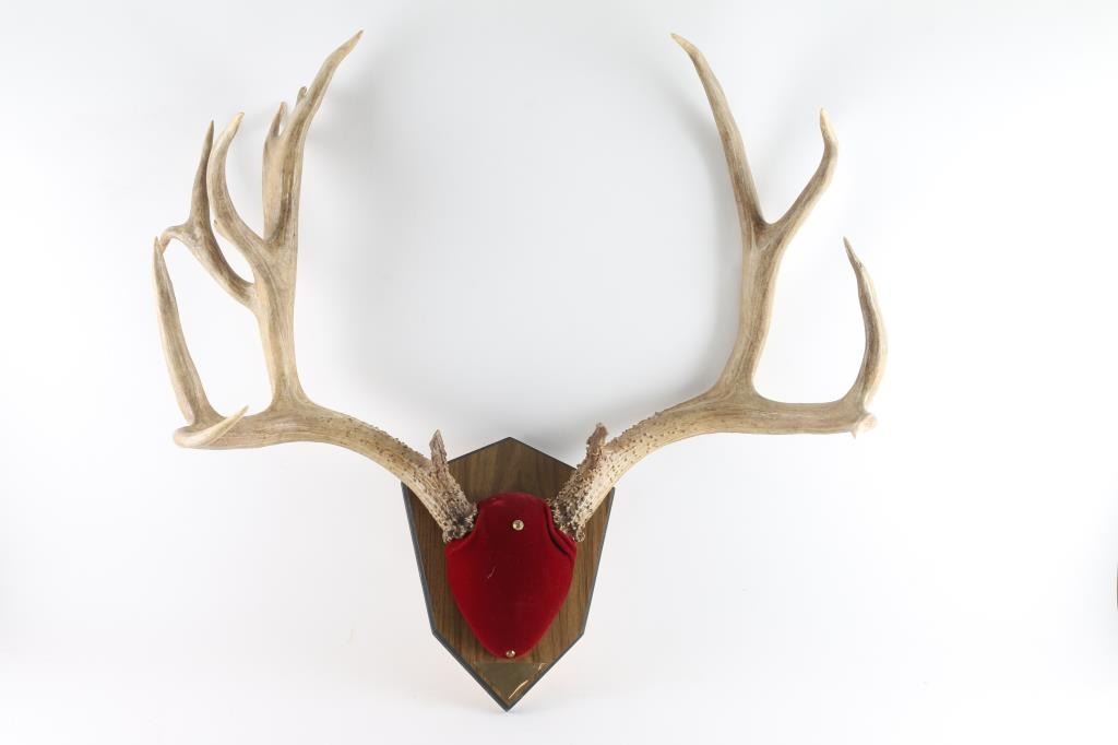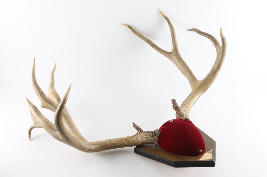 Acquired by consignor "October 28th 1970" out of "Willow Creek Fairfield Idaho, as scribed on back. Mounted on wood with red suede custom fitting. In good condition, with 7 point on one side and 4 on other. Measuring approx 28x24