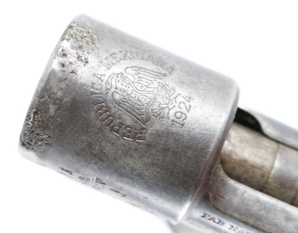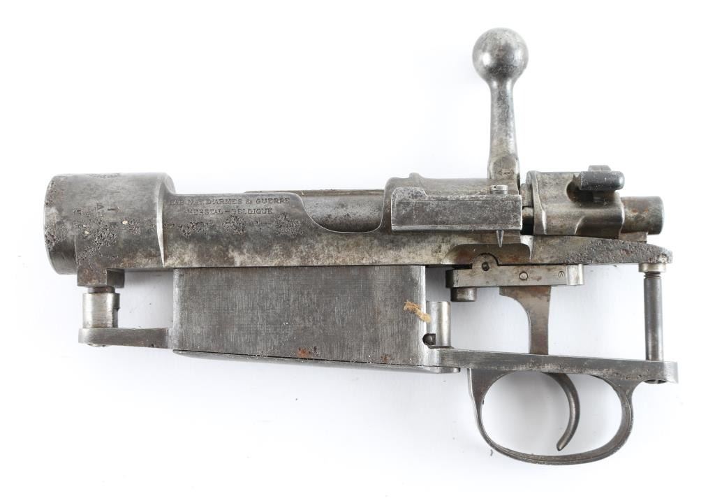 Belgian made model 1924 large ring 1898 type bolt action rifle (Action Only) made for the Mexican government. Appears complete, in about good condition, with moderate pitting along the wood line. No barrel, no stock included. Straight bolt handle. Crest intact. Condition is NRA Good (Action only) *** C&R Firearm ***