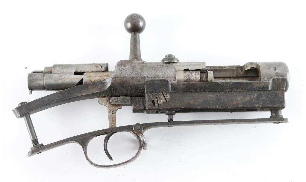 German pre-WWI era Action Only for a military bolt action tube fed repeating rifle. Dated 1887, for black powder cartridge use only. Appears to be a complete action, missing the barrel and stock and other parts. In very good condition. Condition is NRA Very Good as Antique (Action Only) *** Antique Firearm ***