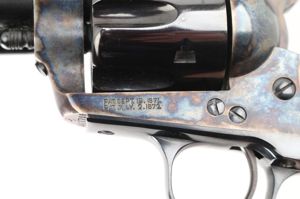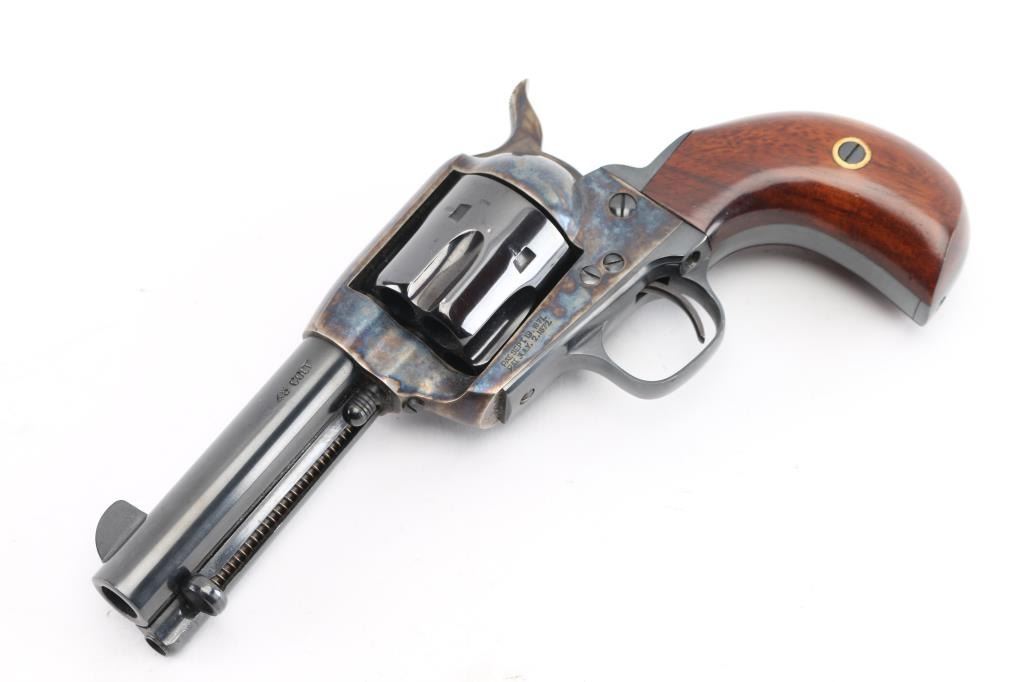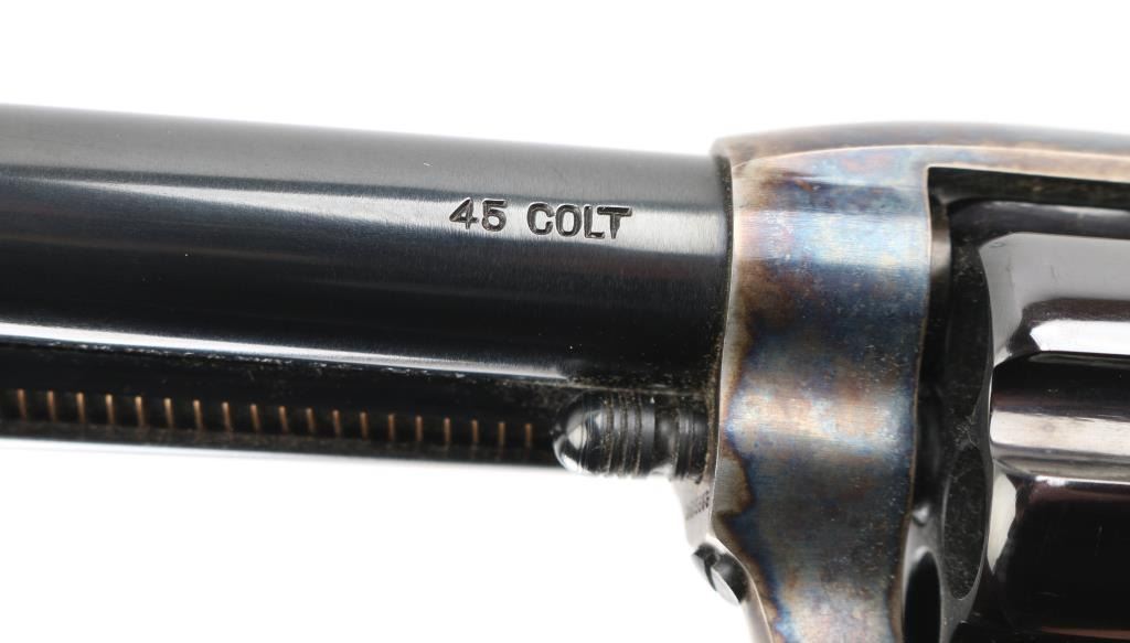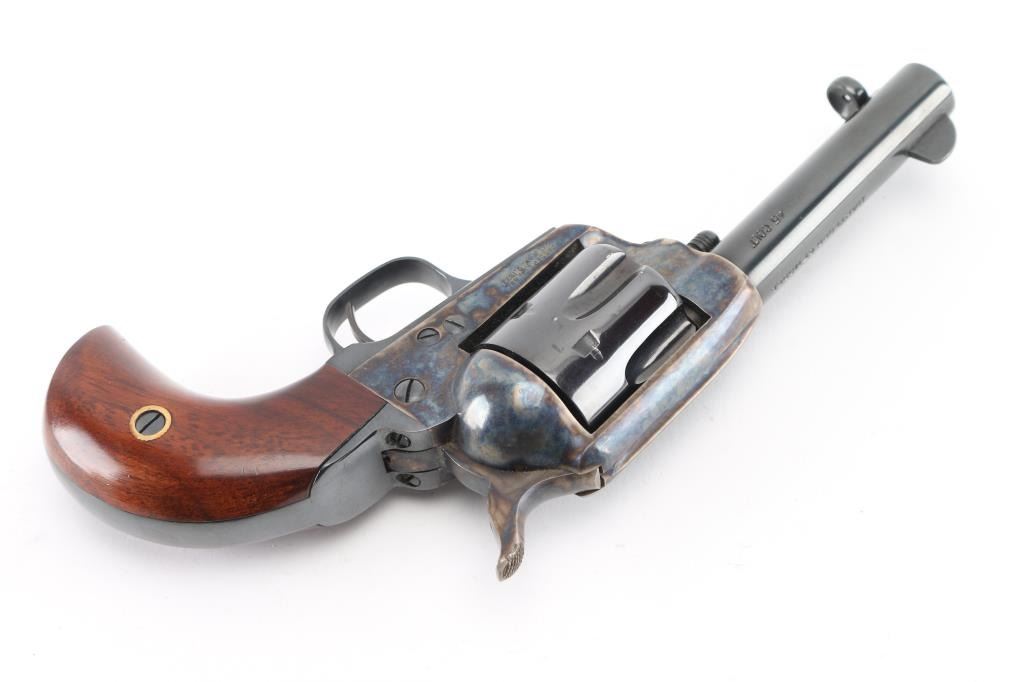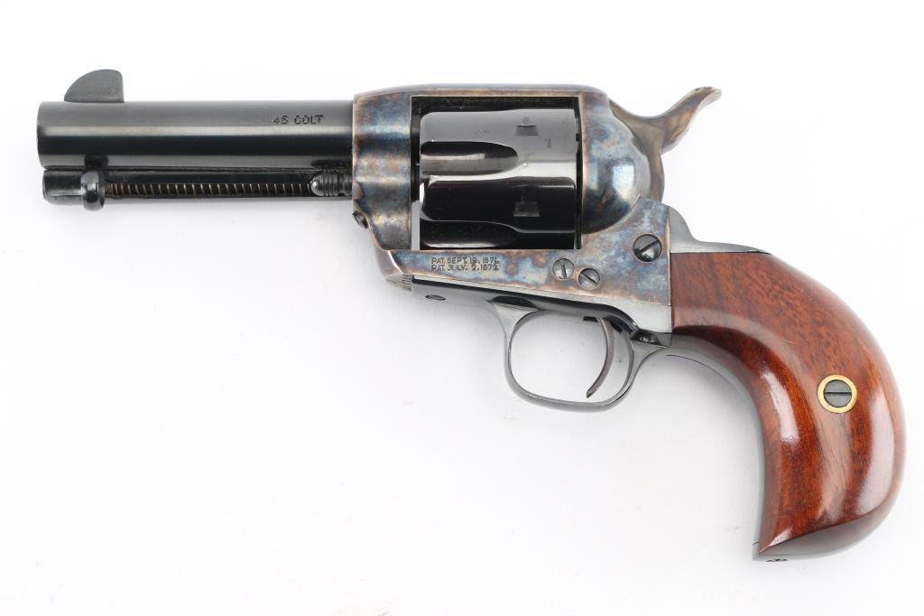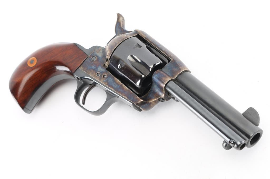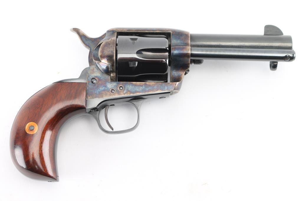 Made in Italy by ASM and imported by EMF. This is a single action 6 shot revolver chambered in .45 Colt. It features a 4" blued barrel with a blade front sight and blued, fluted cylinder, A case colored receiver and hammer with blued trigger guard and backstrap. The birds head grips bring the whole thing together. Metal finish looks good and case colors are good. Grips look great. Bore looks very good but dusty, needs cleaned. Action is smooth/tight. Condition is NRA Very Good. Modern Firearm.