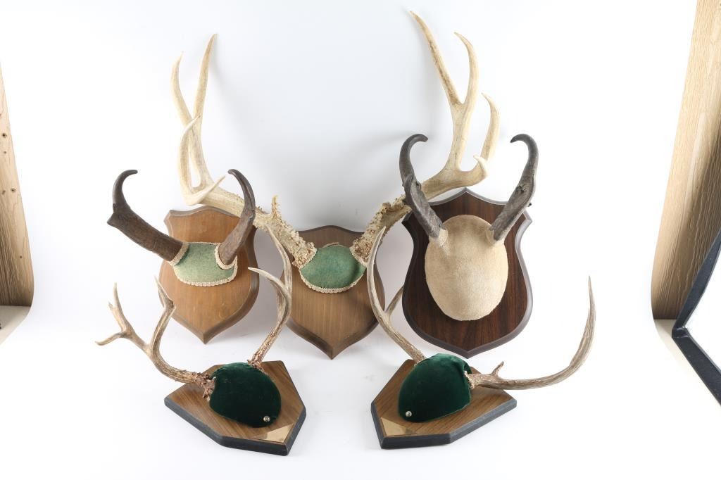 Includes a total of four sets of deer horns, 1 set of pronghorn antlers , all mounted on wood and wrapped with suede an fabric at base of horn. All in good conditions, various sizes and different point counts. Note to buyer must arrange shipping.