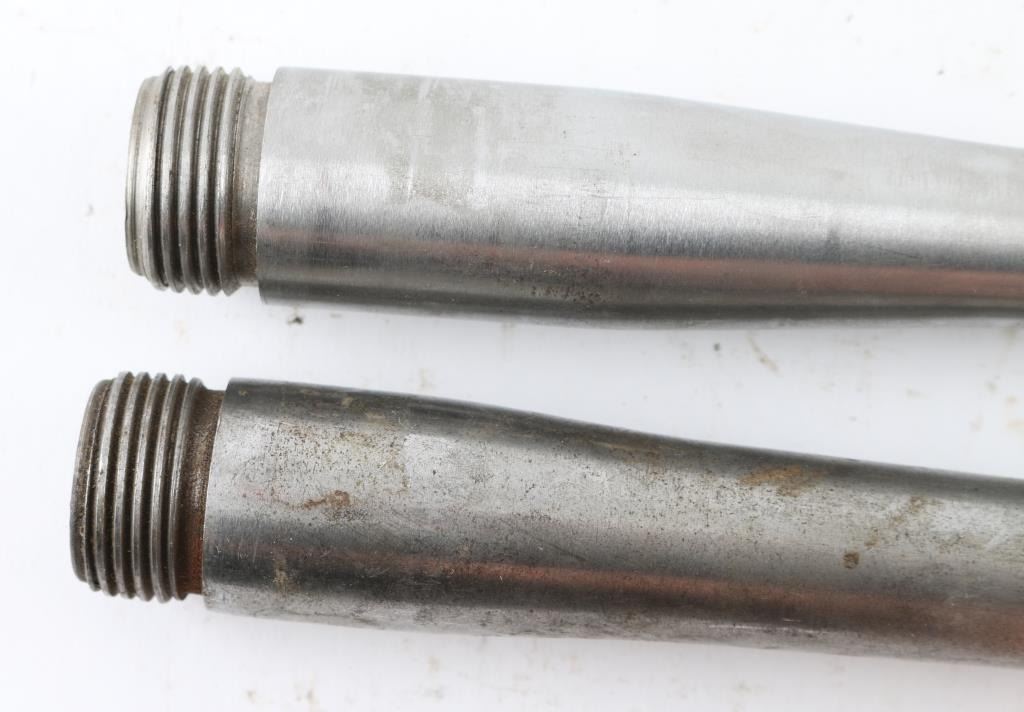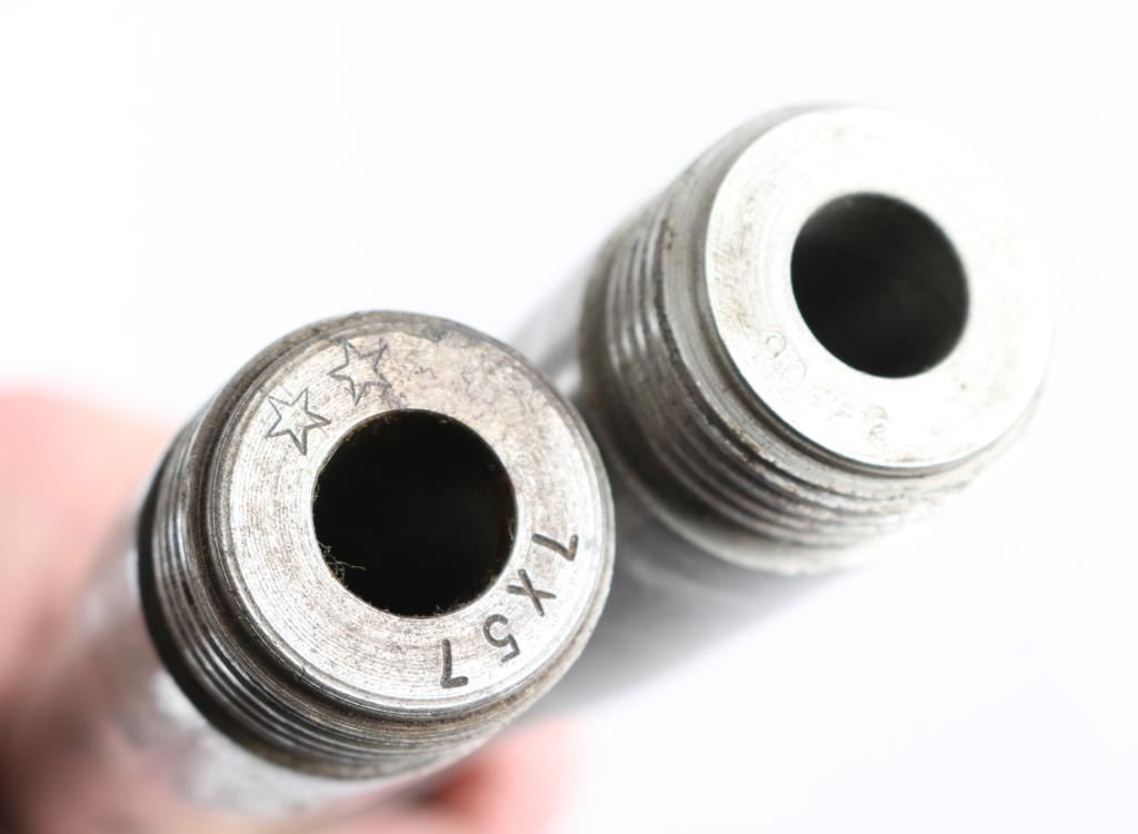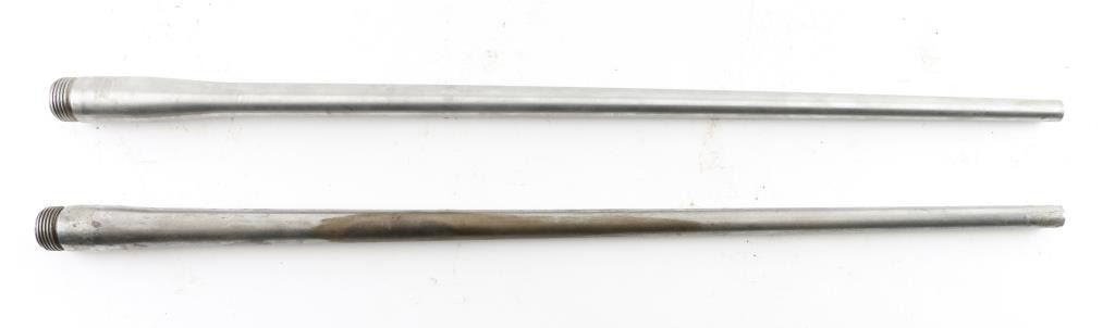 Sporter profile, in the white, chambered, threaded for Large Ring Mauser, approx 24" long, very good, appear never installed. One marked "30-06", the other "7x57"
