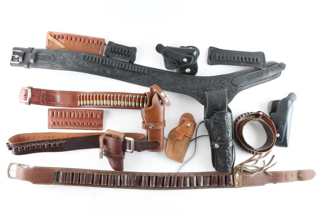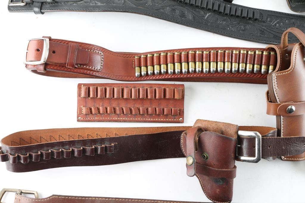 includes two various colored leather gun belts with holsters, one brown colored gun belt with holster and twenty rounds of 44 Magnum silver tips in ammo slots, three various colored leather holsters, four various colored cartridge belt slide ammo holders and two various colored belts. All fair to good condition with some wear.