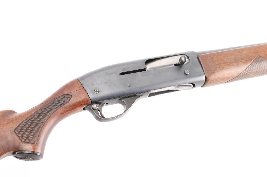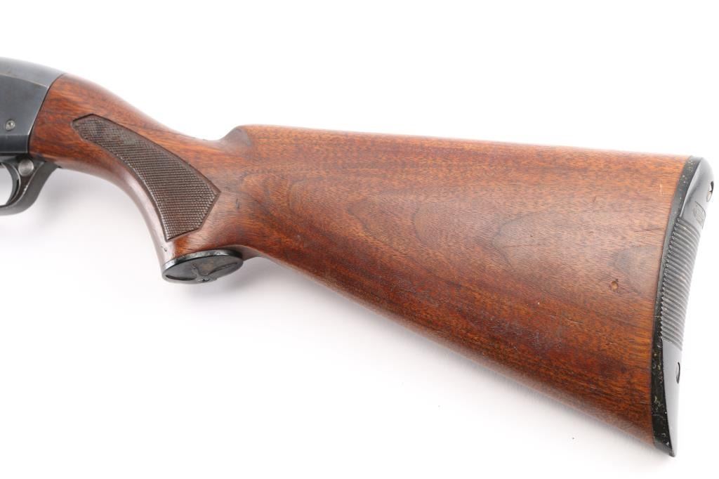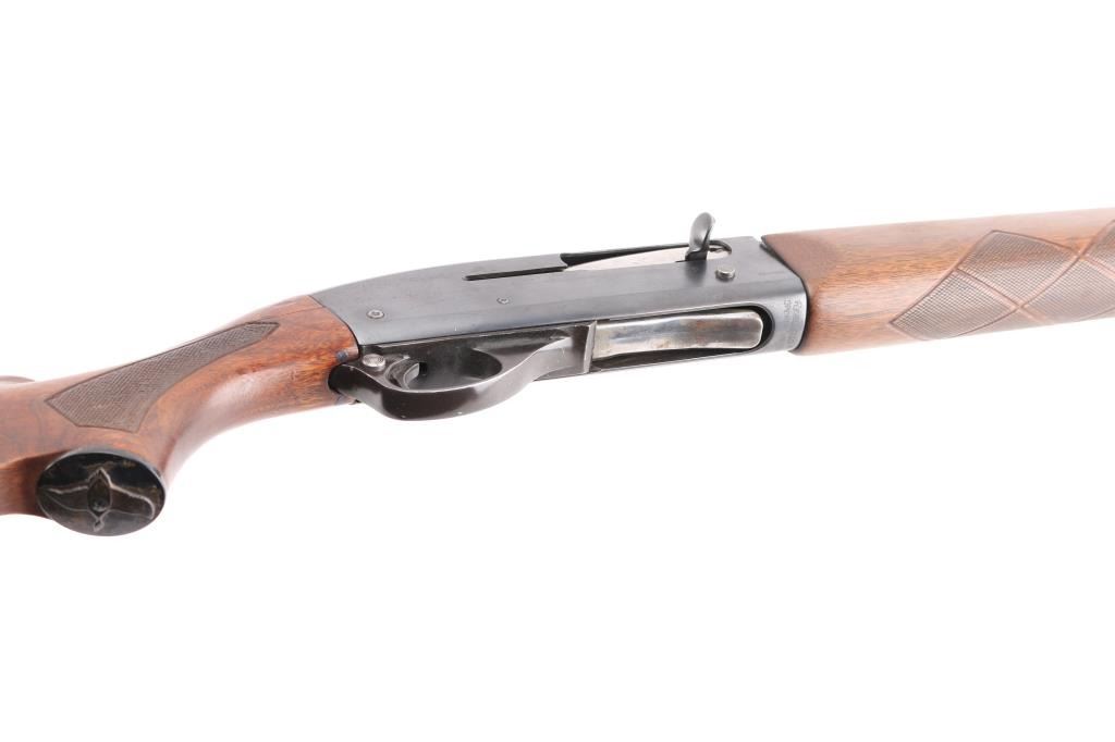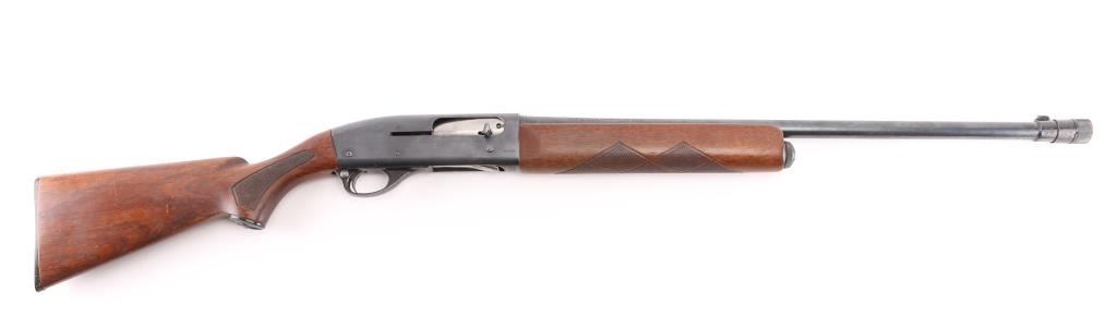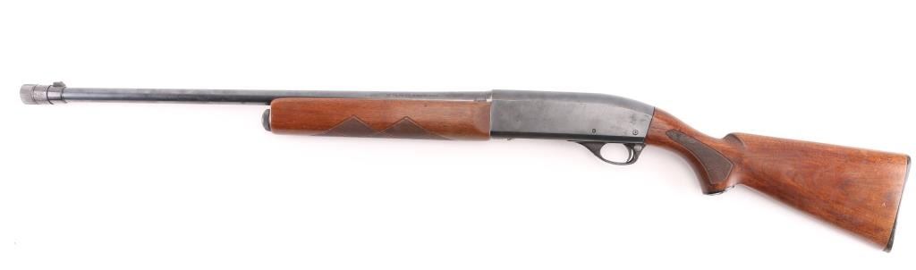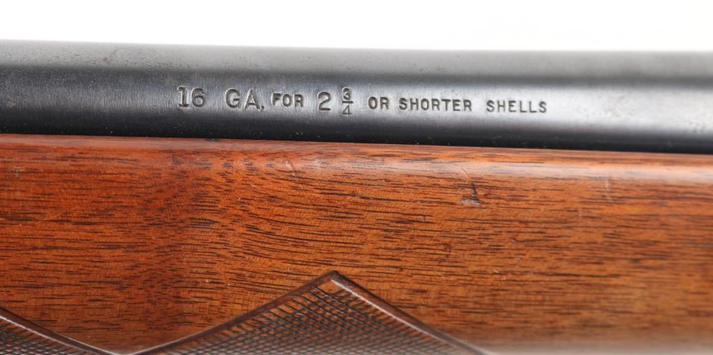 SN:3504545 Semi-automatic 16 gauge shotgun. Blued finish, checkered wood pistol grip stock with serrated hard rubber butt plate, and checkered forearm, 28" barrel with small serrated ramp beaded front sight and "Poly Choke" attachment, smooth trigger and push button safe, black plastic grip plate with goose emblem. Wood is fair overall, shoulder stock shows major repairs, few dents and shallow scratches to forend. Bore and action are excellent. Condition is NRA Good Modern Firearm.