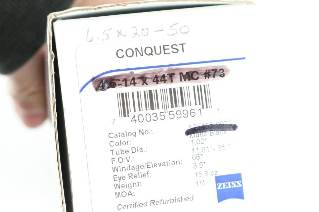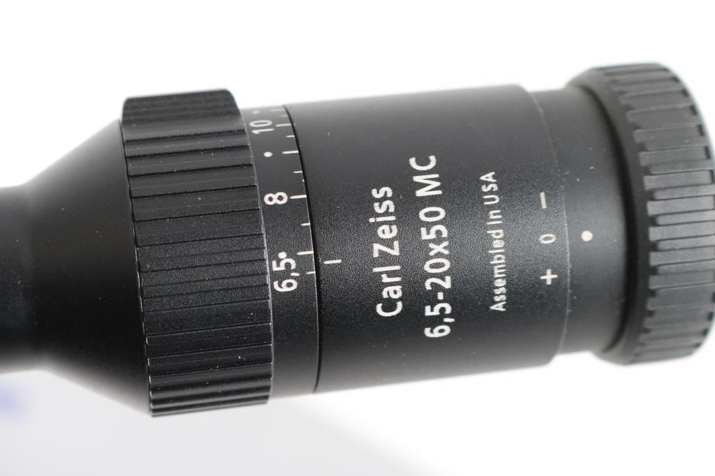 Zeiss 6,5-20x50 MC Conquest Rifle Scope has etched Rapid Z Varmint reticle reticle and 1-piece main body tube construction to withstand heavy recoil. The proprietary lens coating system applied to the lenses on these Zeiss scopes produces clarity and low light performance as well as constant eye relief regardless of magnification. These rifle scopes also feature 1/4 MOA windage and elevation adjustments and is waterproof, fogproof and shockproof. Windage/elevation-66*, eye relief-3.5*F.O.V.-11.61'-35.1'. Like new condition in factory box.
