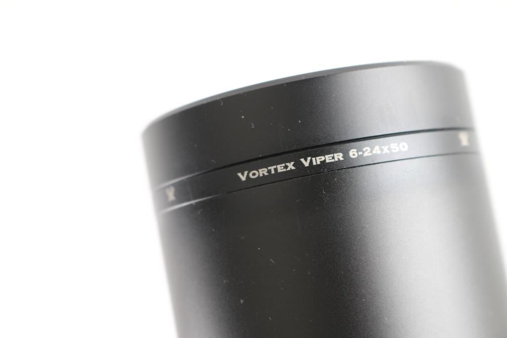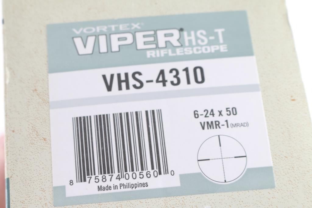The Vortex Viper HST 6-24x50mm Rifle Scope, 30mm Tube, Second Focal Plane, Black, Hard Anodized, Non-Illuminated VMR-1 MRAD Reticle, Mil Rad Adjustment, VHS-4310 Objective Lens Diameter: 50 mm, Magnification: 6 - 24 x, Reticle: VMR-1 MRAD, Tube Diameter: 30 mm, Reticle Focal Plane: Second Focal Plane (SFP), Exit Pupil: 2.08 - 8.3 mm, Finish: Hard Anodized, Field of View, Linear: 5.1 - 17.8 ft at 100 yds, Eye Relief: 4 in, Color: Black, Weight: 22.6 oz, Adjustment Click Value: 0.1 Mil Rad, Length: 15.5 in, Adjustment Type: Mil Rad, Parallax: 50 yds to infinity, Fabric/Material: Aircraft Grade Aluminum, Adjustment Range: 65 MOA, Height: 2.26 in, Focus Range: 50 yds to infinity, Lens Material: Glass, Optical Coating: XR Fully Multi-Coated, Water Resistance Level: Waterproof, Shockproof: Yes, Fogproof: Yes. New in the factory box, still in its original packaging, with detachable sun shade.