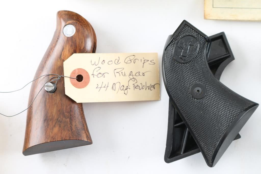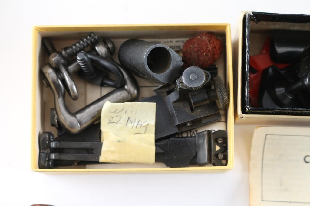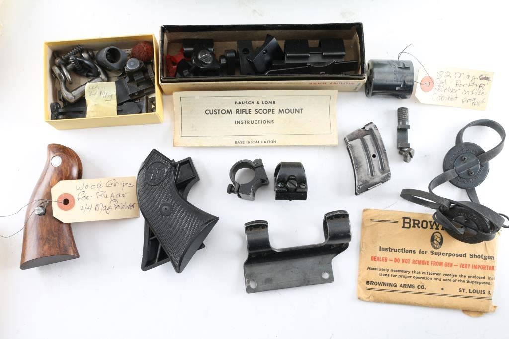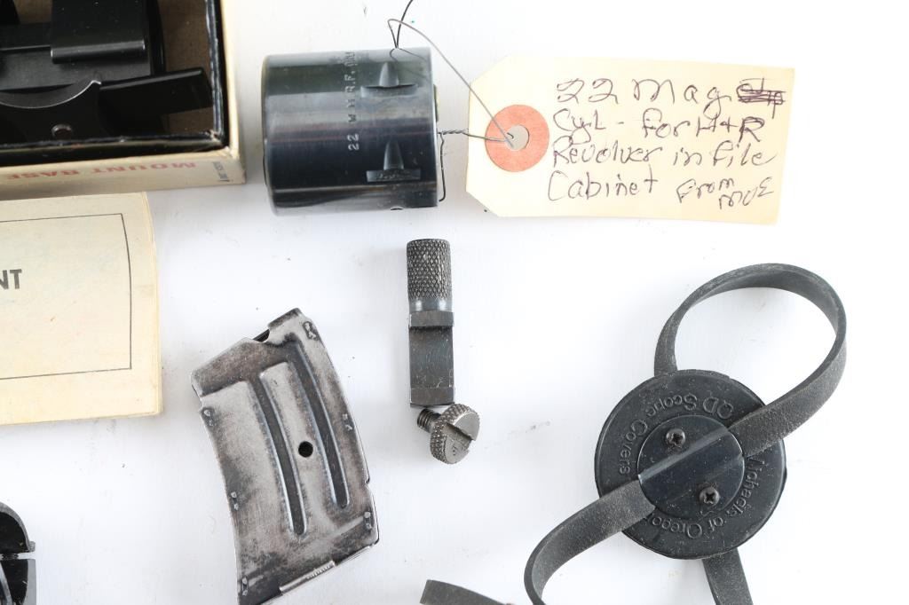 Includes one pair of black plastic grips for Colt revolver, one pair of wooden grips for 44 Magnum Ruger, Bausch & Lomb custom rifle scope mount, .22 magnum cylinder for H&R revolver, two sets of small scope mounts, two pairs of iron sights and sling swivels for .22 Magnum, one bikini scope lens cover and one 8 round .22 Cal magazine. All in green plastic tackle box.