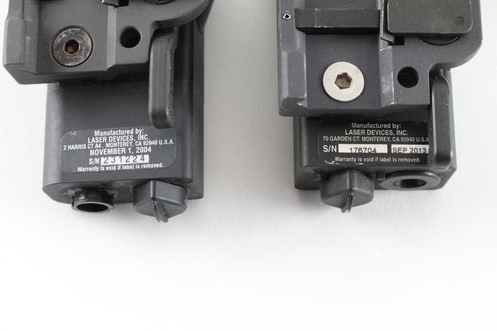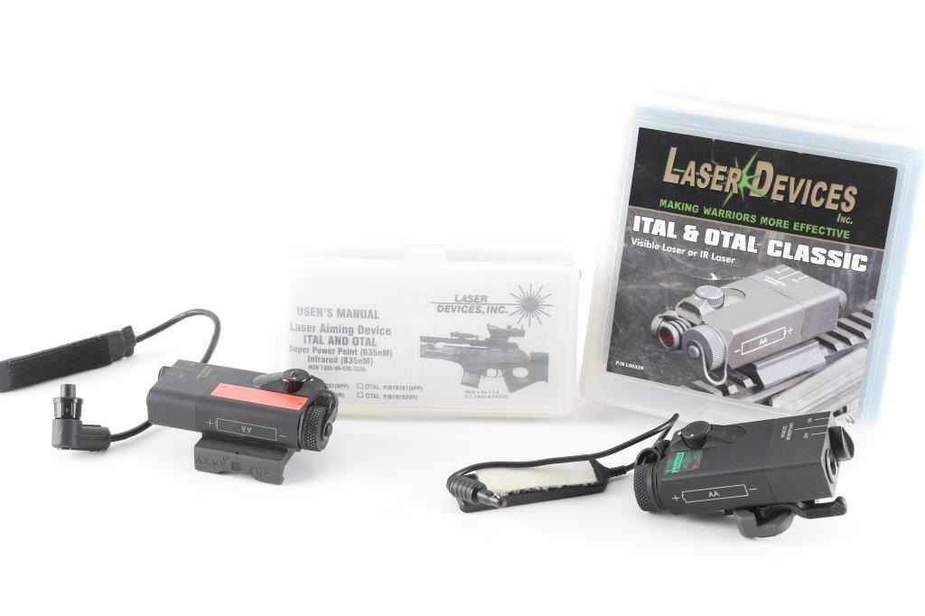 1) Laser devices Inc. ITAL Classic, operates on one AA battery A.R,M.S. #17S throw lever installed, will mount on ant standard NATO 1913 rail. 7" Cable Remote Pressure Pad Switch 19204. Comes in factory case with manual. 2) Same as above except this is a Laser devices Inc. OTAL laser sight SSP. Both in very good condition.