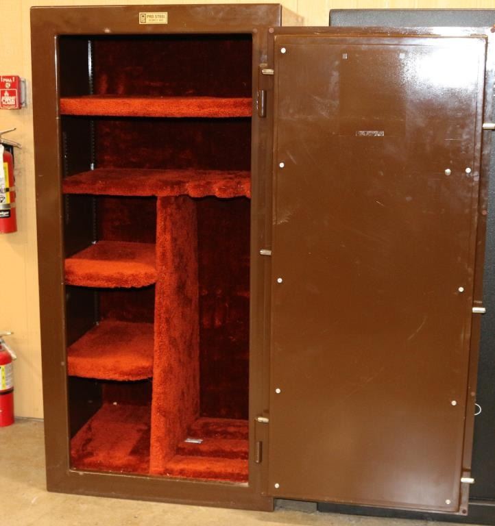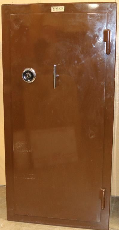 This Pro Steel Security Vault is brown on the outside and shows its vintage age. Inside is removable orange carpeted shelving and the original manual for the safe. Would make a perfect garage safe. Measures 24"D X 30"W by 61"H. Code: Left 4x to 51, Right 3x to 17, Left 2x to 79, Right to 0.