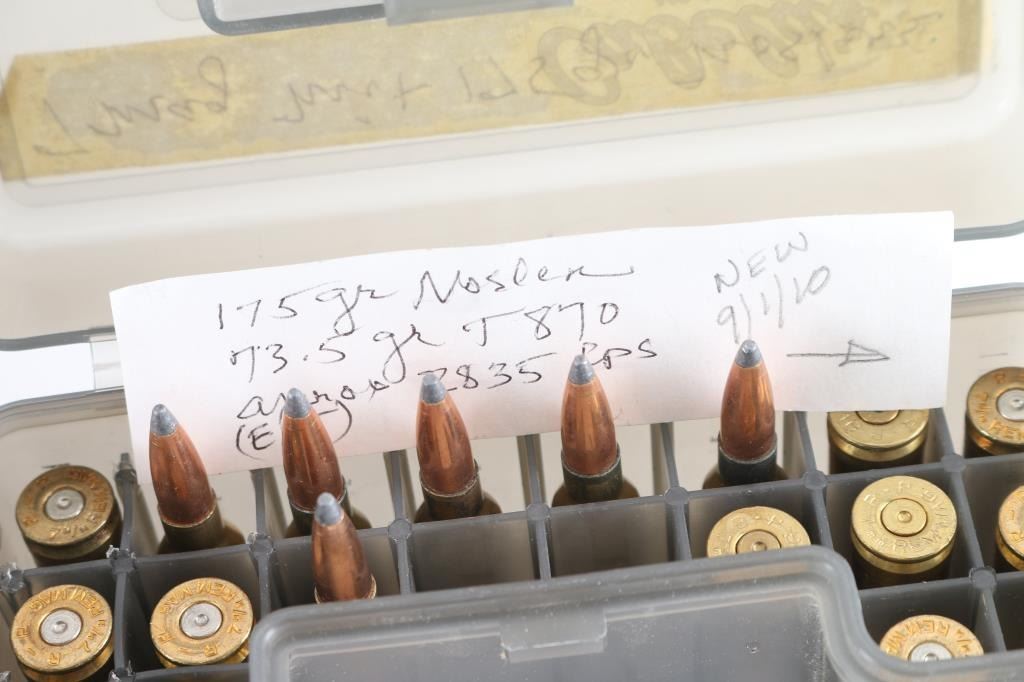 both factory & reloads, also some fired cases. Includes approx 30 rounds Federal in factory boxes, A box of Peters brand appears about half factory and half reloads. Several plastic reloader boxes with reloads and cases. Some partial full boxes, Approx 70 rounds ammo total.