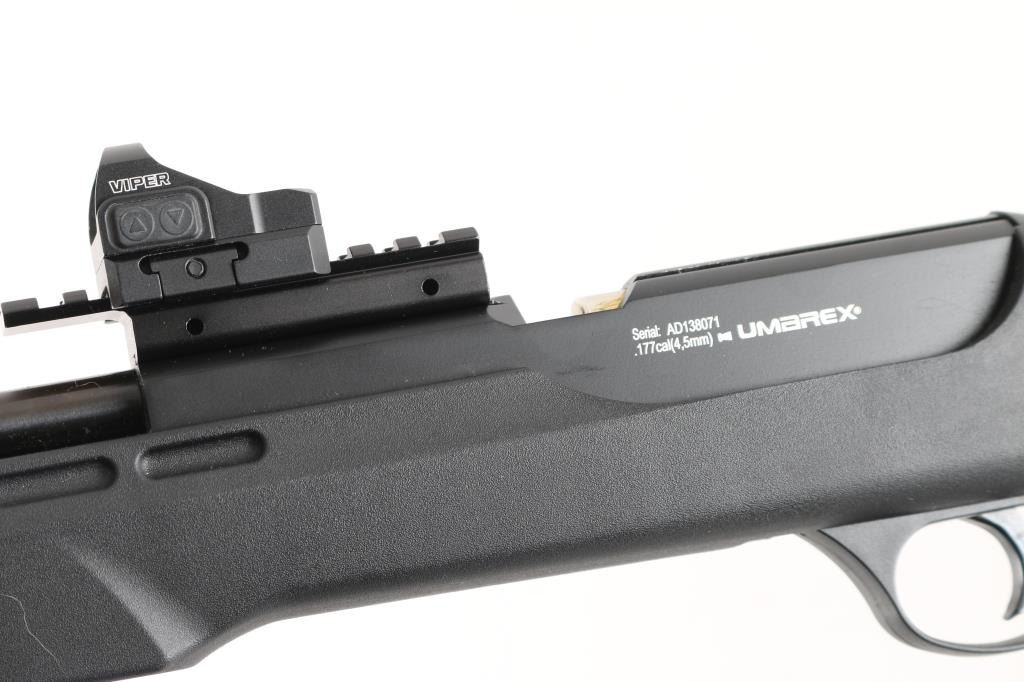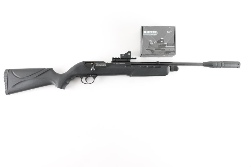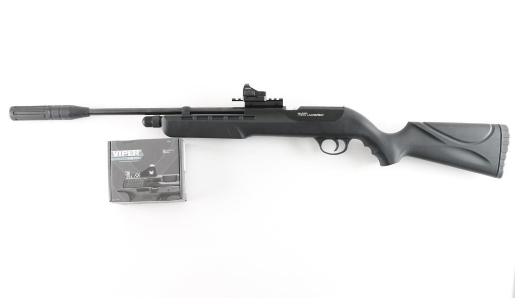 CO2 powered single shot air rifle for pellets only. Blued steel, black polymer stock, manual safety. 18" barrel with sound dampener. Mounts a Vortex Viper red dot sight. Overall excellent condition.