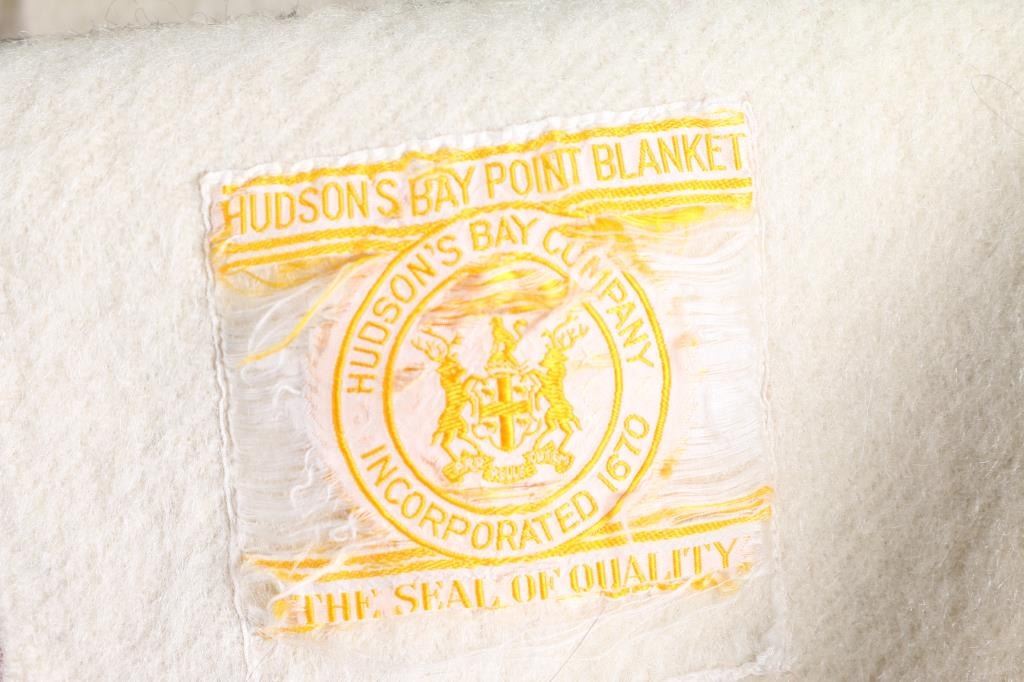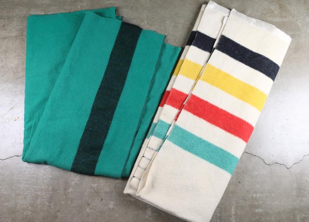 1.) Hudson bay point blanket, (2.) A one grey and green pierce blanket.