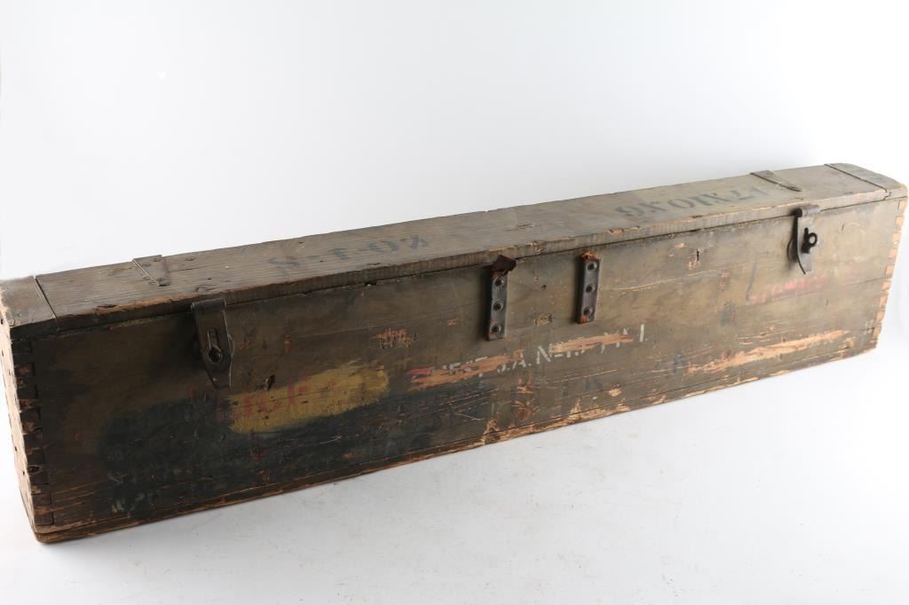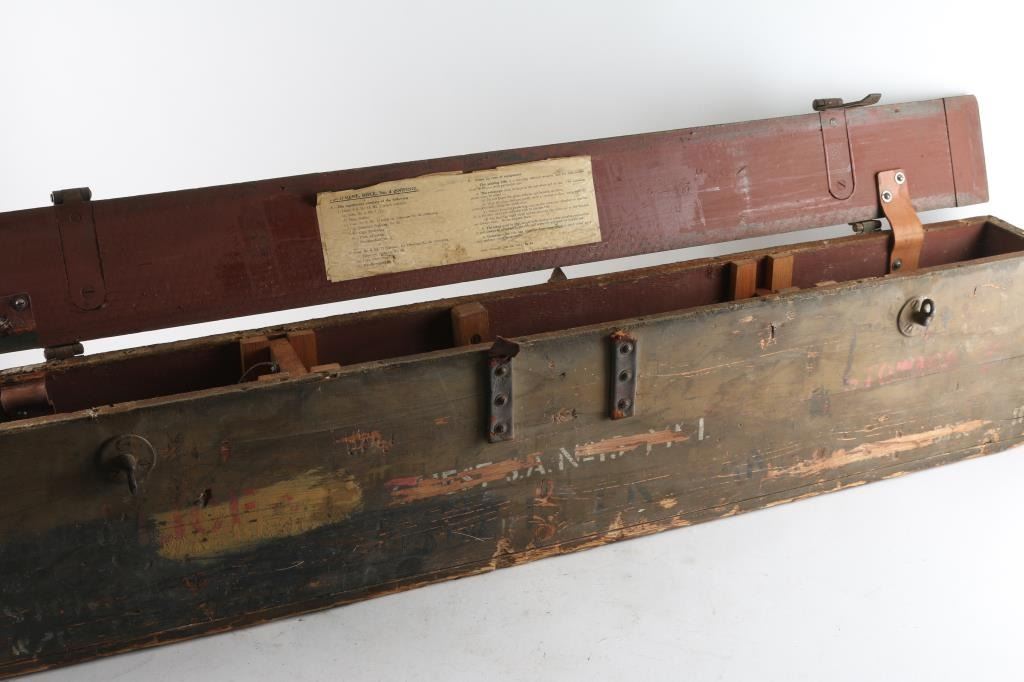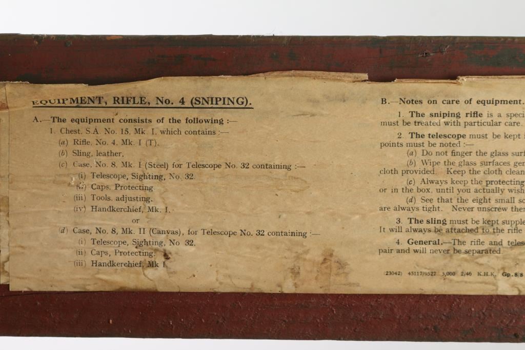 Wood box with hinged lid, some instructions on inside of lid. Good condition overall, leather handles missing. large & heavy. For No. 4 Mk I (T) rifle.