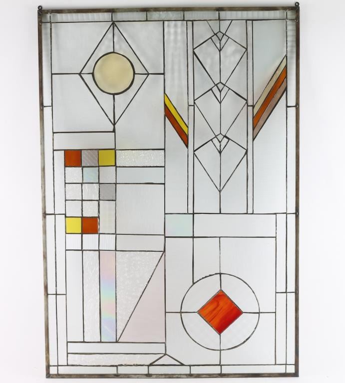 Beautifully pieced with etched, stained, and carved glass, accented with red, orange stained glass. With stone quartz in middle for sunlight effect. Framed in metal frame with hanger for window light. Measuring 32.5x22.5