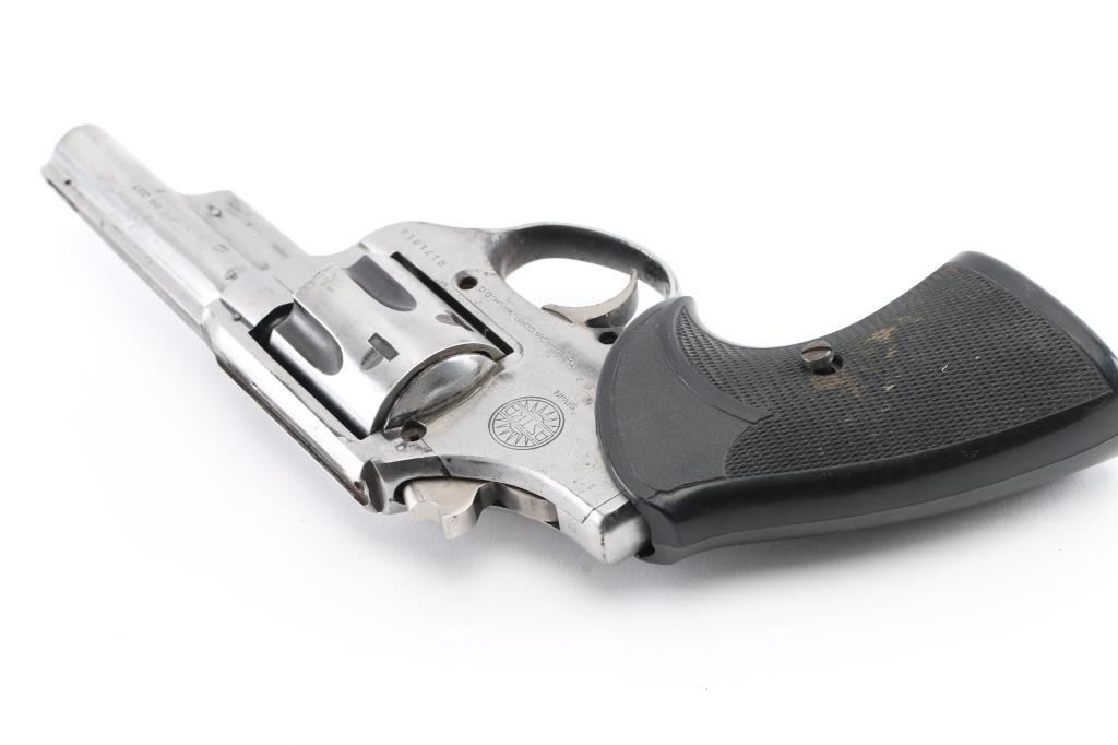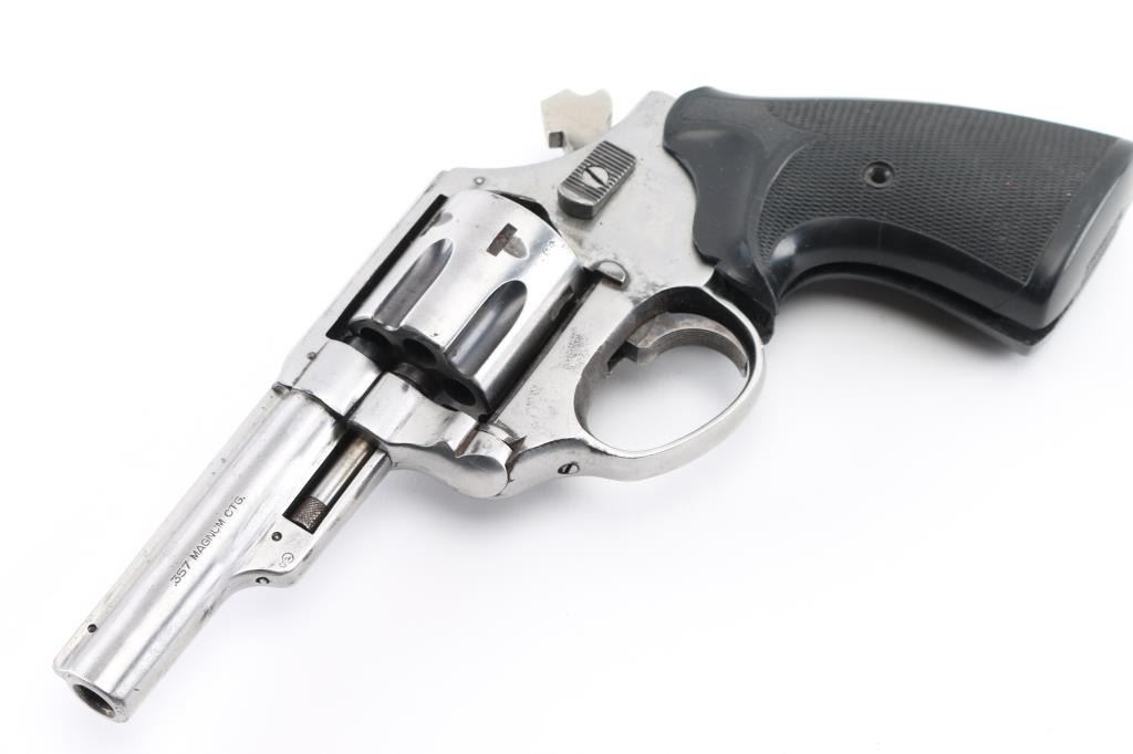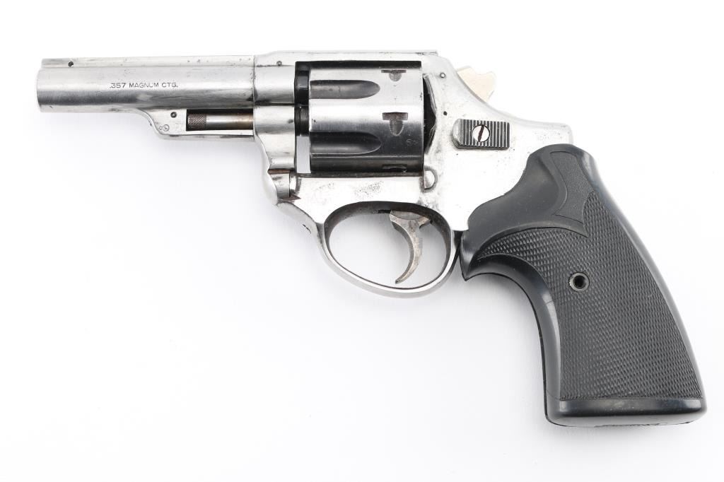 Note* Parts/Project gun. Spanish revolver in 357 magnum, imported by the Garcia Corp of Washington D.C. Features, six shot cylinder, and an approx. 4 inch barrel. Inoperable. Missing frame screws,cylinder release is frozen, miss sights, blue is mostly gone, trigger & hammer are loose, ill-fitting Pachmyer grips. Condition is NRA Poor/Inoperable. Modern Firearm.