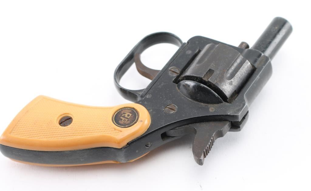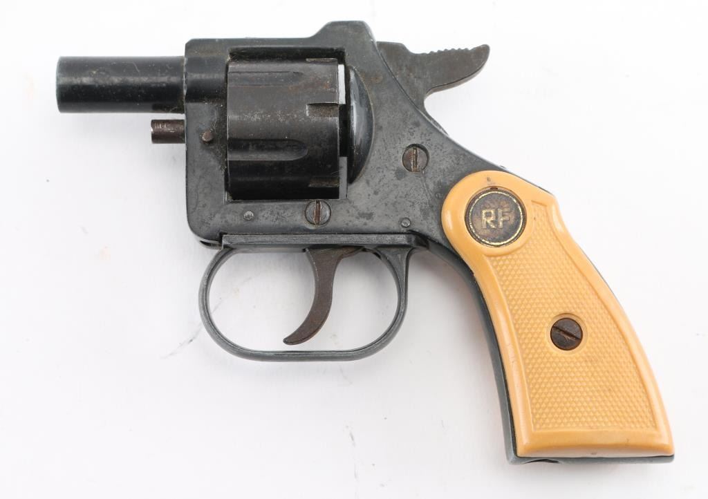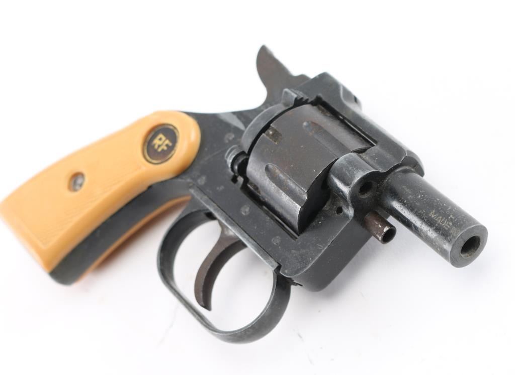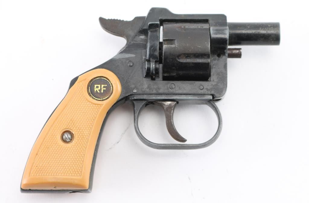 Appears similar to a Rohm or RG, with partially closed cylinder, for blanks only. Grips marked "RF", barrel shortened, no markings on metal other than "Made in". In fair condition overall, with chips missing from grips, no front sight, missing ejector pin. Functions in double action, cylinder does not turn when hammer cocked.