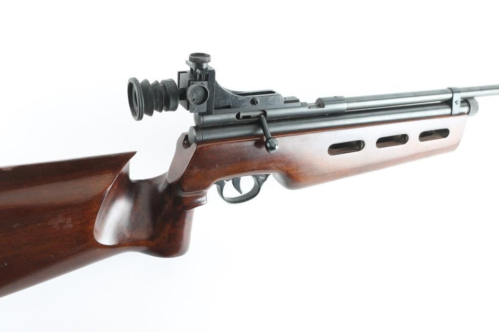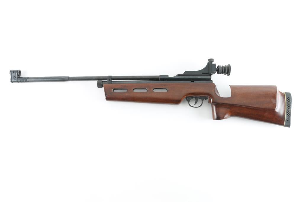 SN: 0601A20255. Chinese made , bolt action, Co2 powered, target air rifle, 27" barrel with globe front sight, and rear aperture peep sight with rubber eye cup, manual safety, rubber recoil pad, ported wood stock, with contoured pistol grip for right handed shooting. Appears to function, but could nut test it, no C02 cartridges. Very good condition. "Antique" Firearm