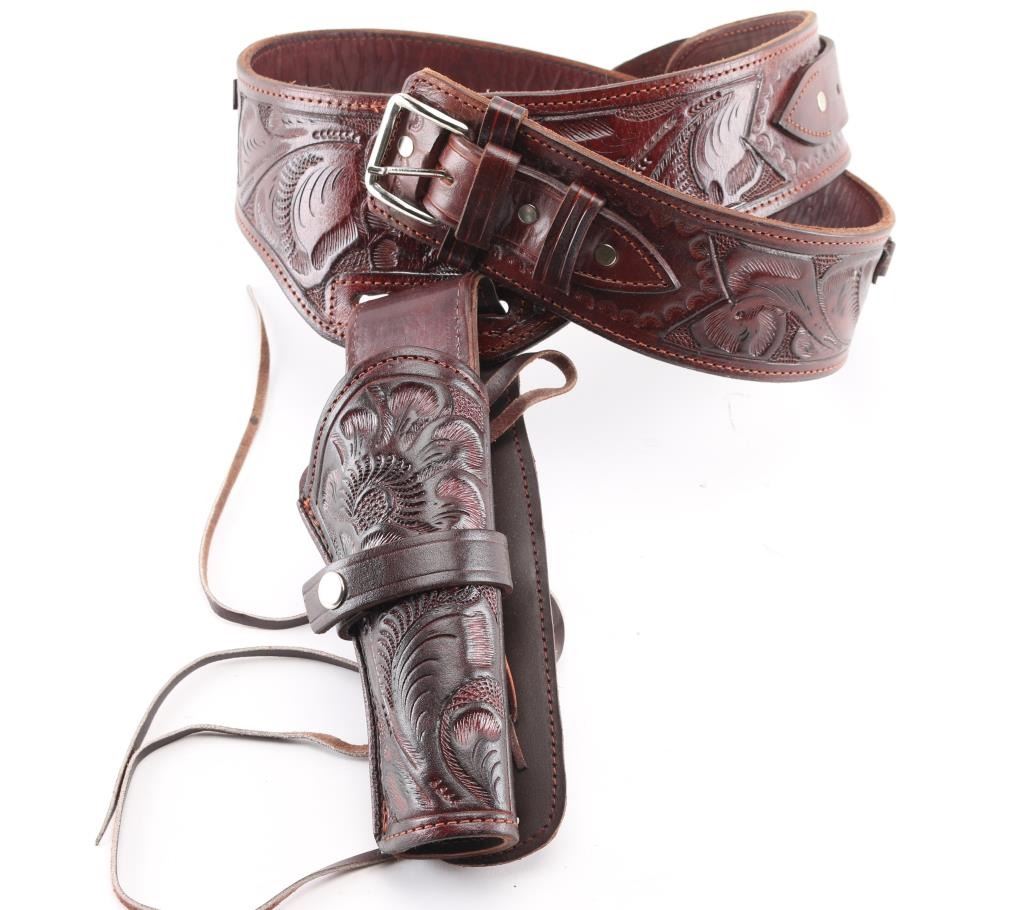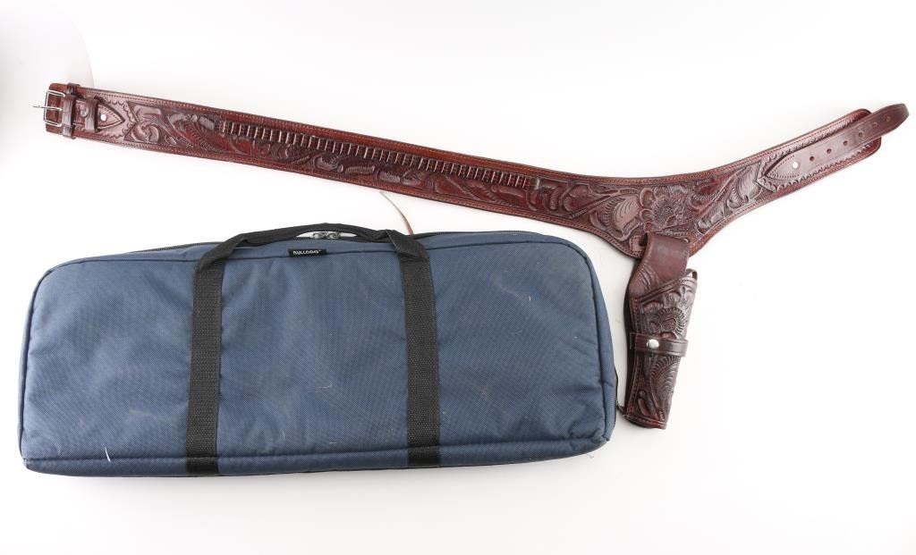 Gun belt rig, 'Buscadero' style with .22 cal cartridge loops on belt, floral carved brown leather, 46" waist, holster length best fits an approx 5" barrel. (1) Bulldog 2 gun/carbine/SMG padded soft case, with insert. Insert has two AR15/M4 magazine pouches. Condition for both are excellent.