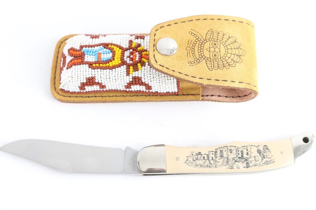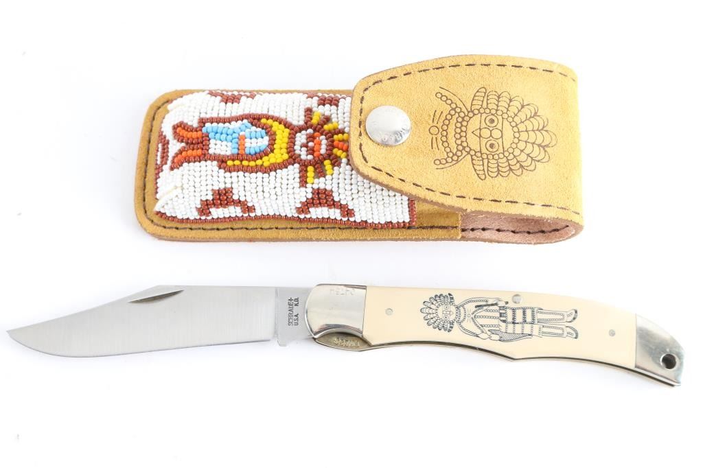 Schrade Cutlery Kachina Scrimshaw Limited Edition Liner Lock Folder Knife with Beaded Pouch - # 04764 of of 10,000, Includes Information Sheet and Inserts, American Indian Series, in original box Made in USA , Very good condition.