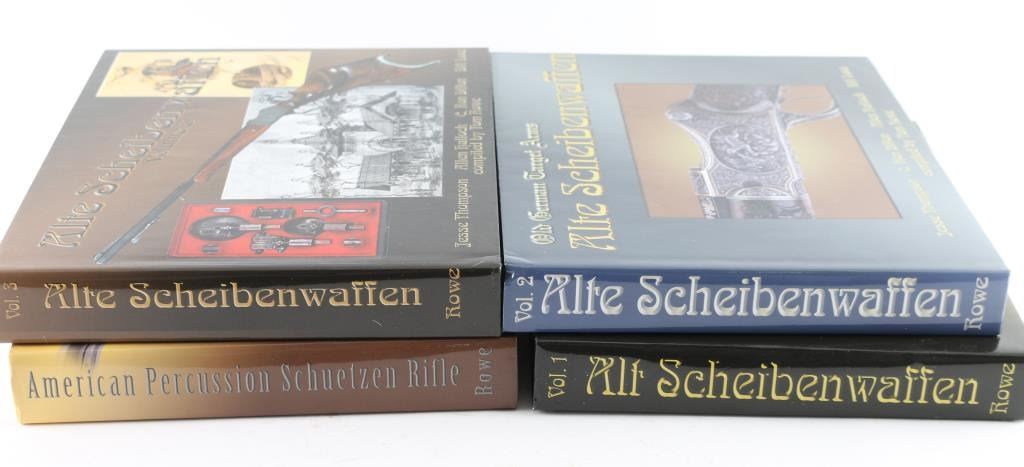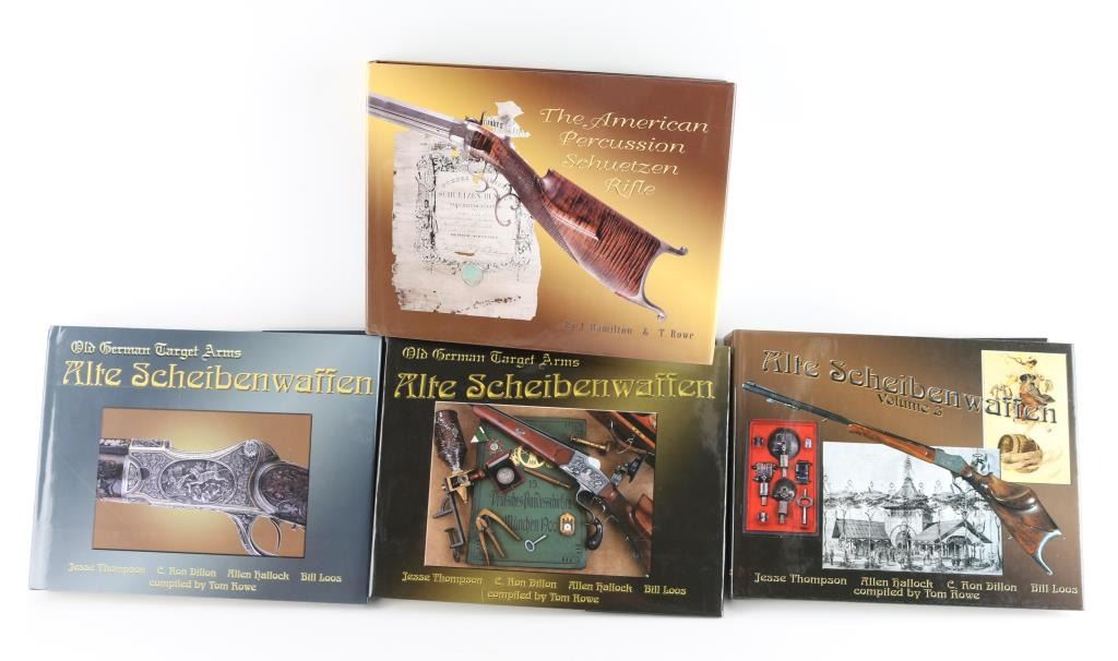 Four total books: 1) "Alte Scheibenwaffen" - Old German Target Arms, First Edition, Volumes 1, 2 & 3. 2) "The American Percussion Schuetzen Rifle", First Edition. Very nice lot. All used.