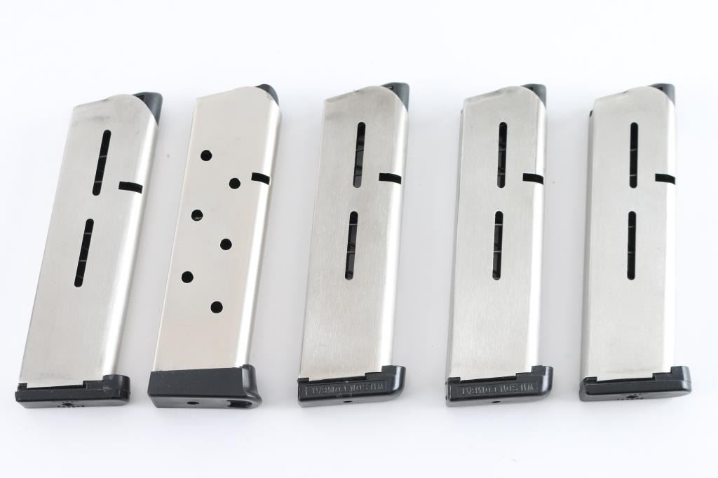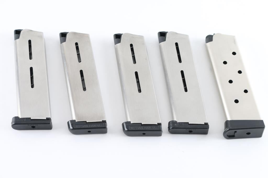 (5) Wilson Combat stainless 45 ACP Magazines, one with buttplate extension. All in excellent condition.
