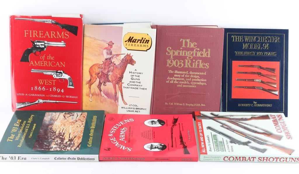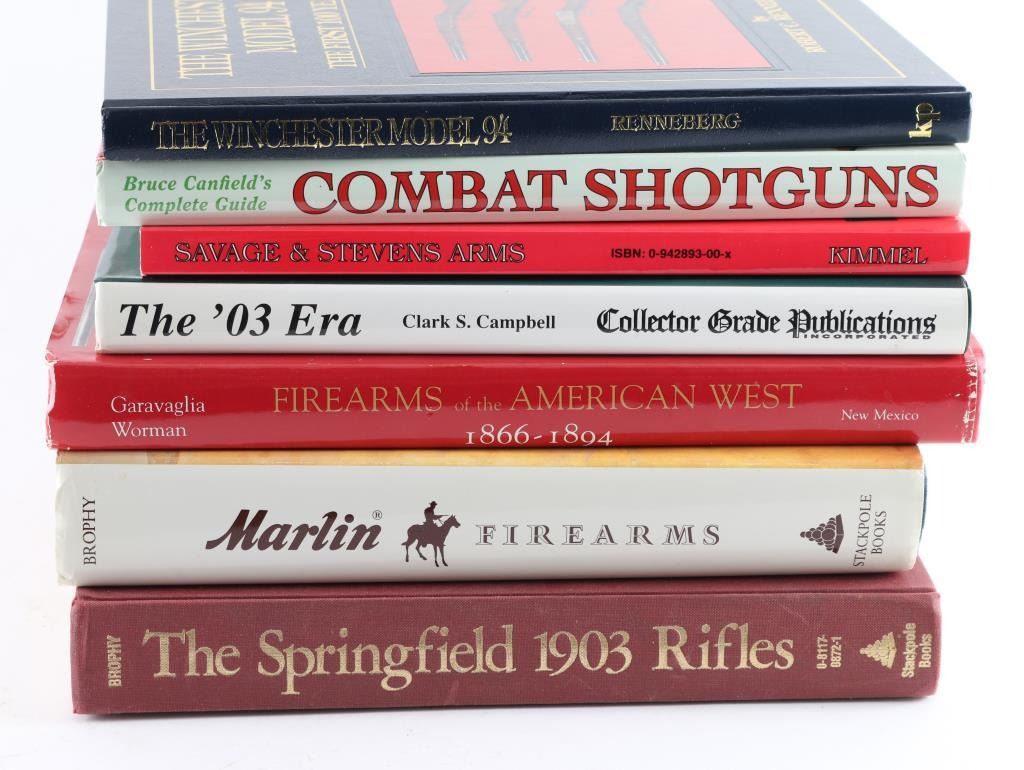 Seven total books: 1) "The Springfield 1903 Rifles" 2) "The '03 Era: When Smokeless Revolutionized U.S. Riflery" 3) "Savage & Stevens Arms" 4) "Bruce Canfield's Complete Guide U.S. Military Combat Shotguns" 5) "Marlin Firearms, A history of the guns and the company that made them" 6) "Firearms of the American West" 7) "The Winchester Model 94". All very nice. All used.