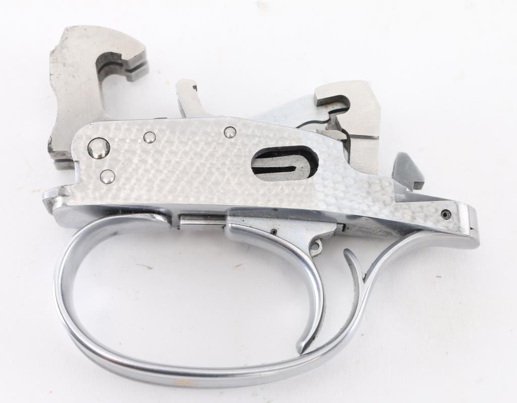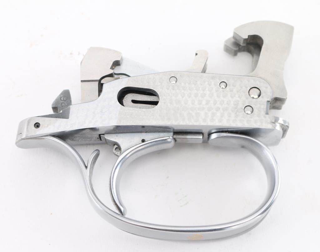 in excellent condition, stainless steel with jeweled sides. Appears to fit DT-10 or DT-11 shotguns. Labeled "TRAP" in gold inlay on bottom of trigger guard.