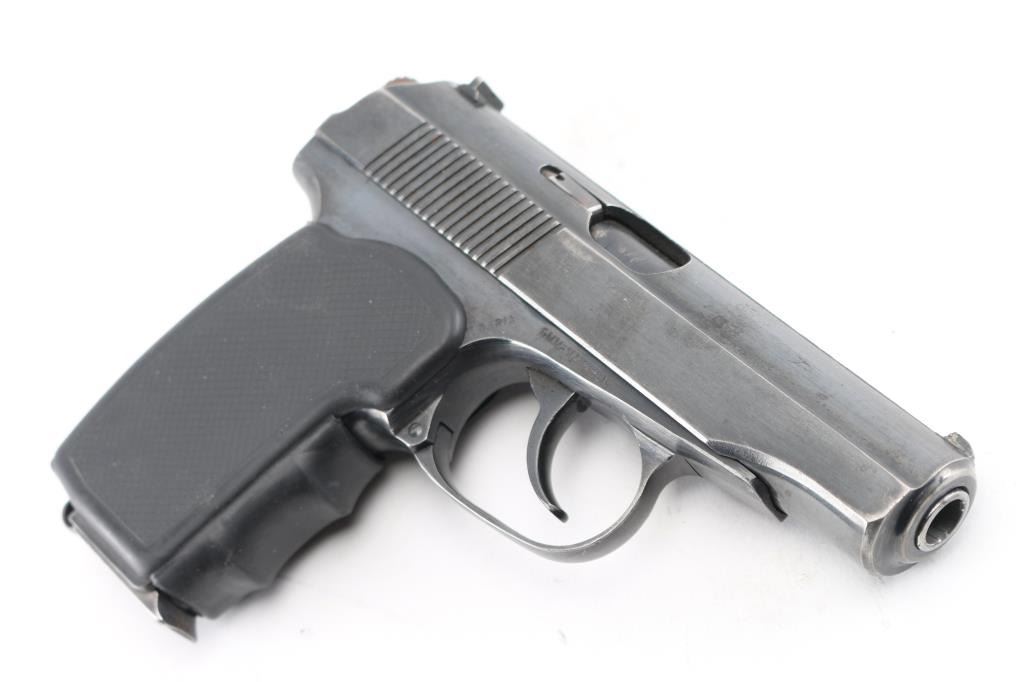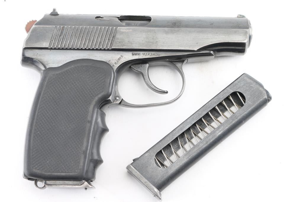 'Circle 10' Bulgarian made copy of the Soviet PM Makarov pistol (itself a modification & development of the Walther PP type pistol) chambered in 9x18mm Makarov. Imported by CAI, Georgia VT. Features all steel construction, a blued finish, 3.8" fixed barrel, blade front sight, dovetailed rear sight with square notch, smooth trigger, serrated round hammer spur, thumb safety/decocker on the left side of the slide, slide catch on the left side of the frame, heel magazine release, 8 round magazine and checkered one-piece black polymer aftermarket grip. Bore is very good condition. Retains 80% finish with moderate edge losses, scratches. Grips are very good. Includes spare magazine. Condition is NRA Very Good *** Modern Firearm ***