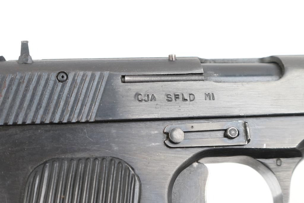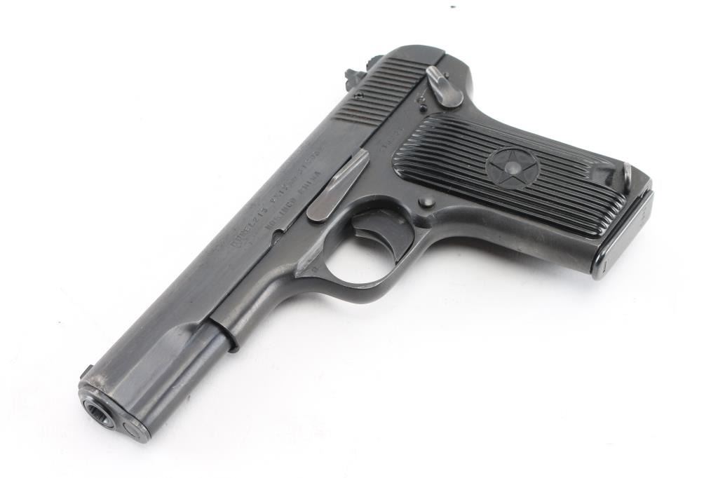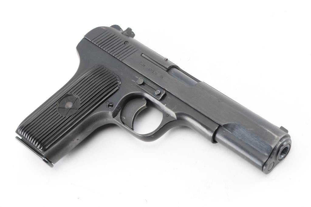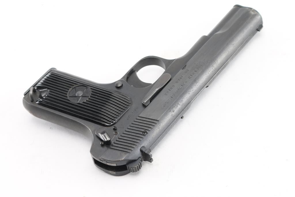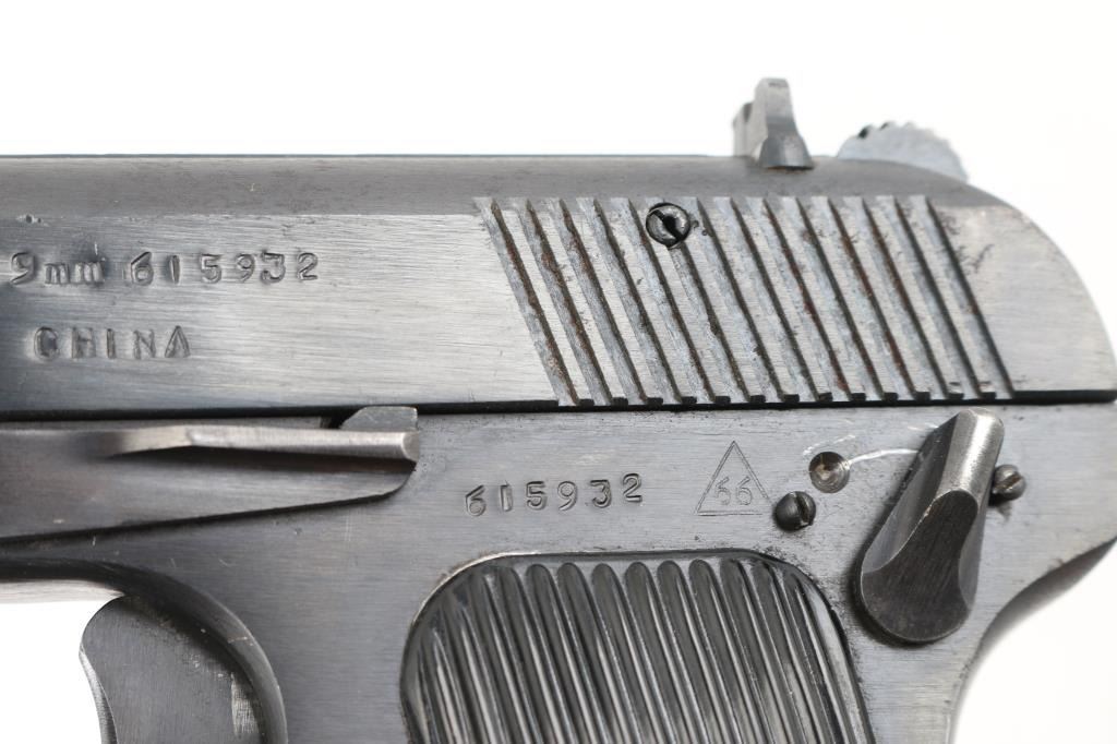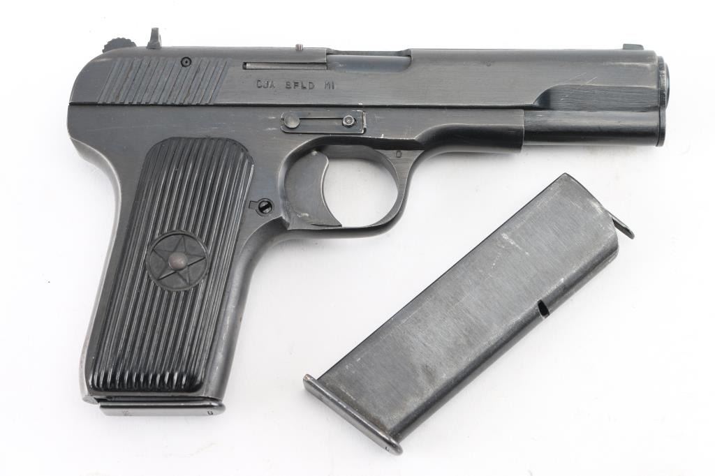 Chinese made semiautomatic pistol imported by CJA, SFLD MI. A slightly modified Tokarev pistol, features 4.4" barrel, fixed sights, single action, frame mounted manual safety, lanyard loop on frame, pushbutton mag release, blued finish, grooved black plastic grips with embossed star emblem. This model uses a narrow magazine and has a narrow spacer pinned into the mag well. Bore is very good. Retains 90% dark black finish, with edge losses and several scrapes. Grips are very good. Includes two magazines, numbered but not matching. Condition is near NRA Excellent *** Modern Firearm ***