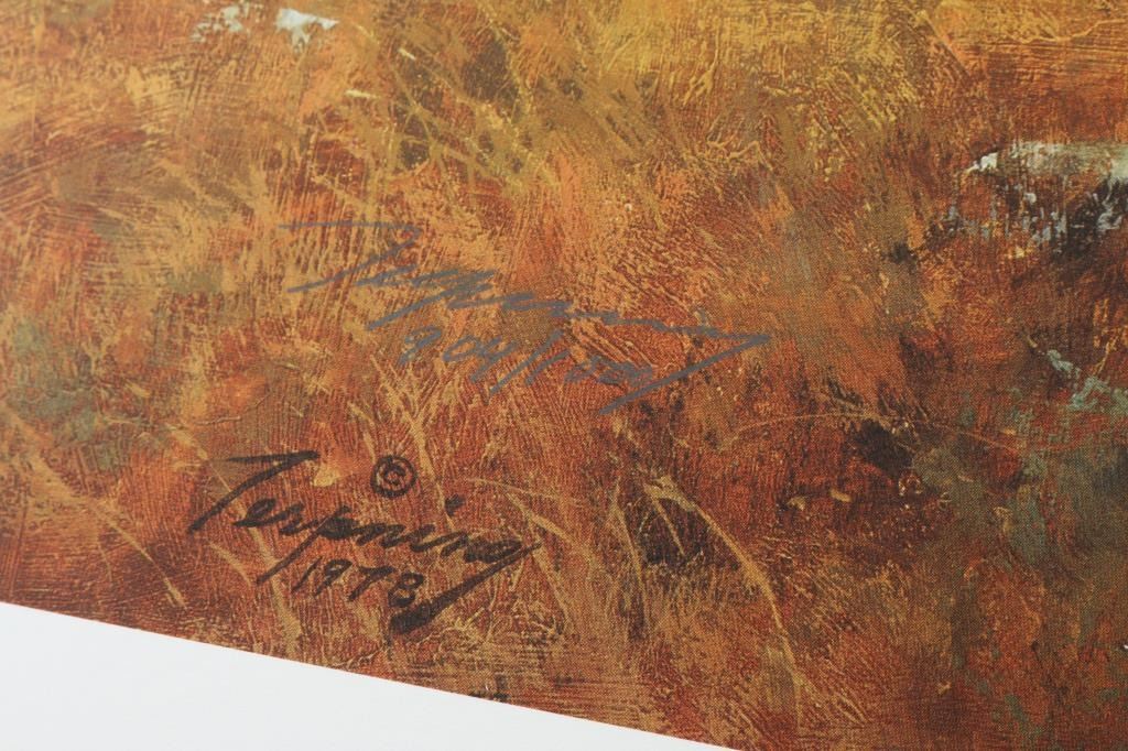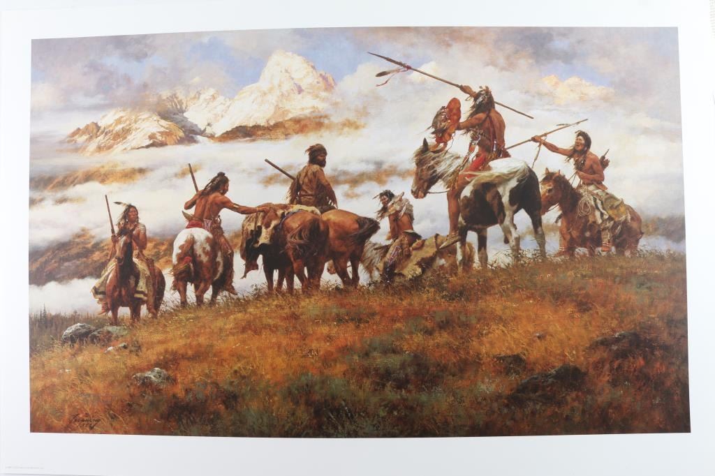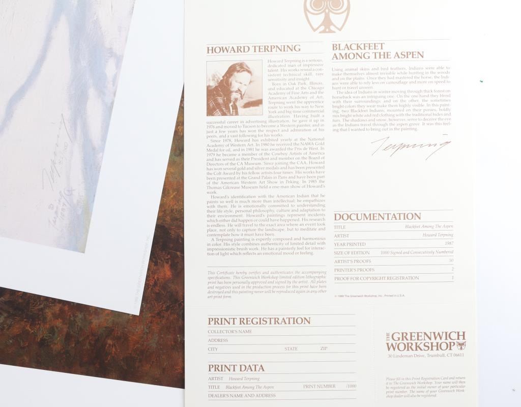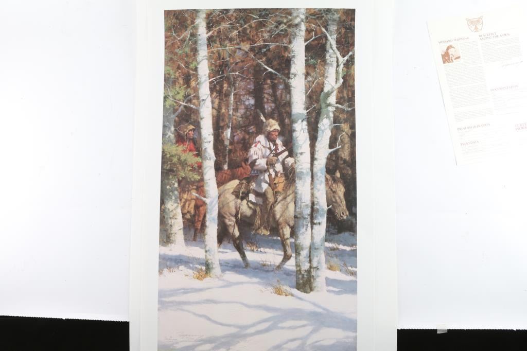 By famous artist "Howard Terpning" includes two different limited edition prints in art folio's. (1.) Entitled "Black-Foot Among The Aspens" numbered and signed lower right "339&952/1000" measures 36x23.5 in good condition. Also included is a Howard Terpning print , entitled "The ploy, measuring 36x23.5, signed an numbered 904/1000. This lot also includes a Greenwich workshop certificate.