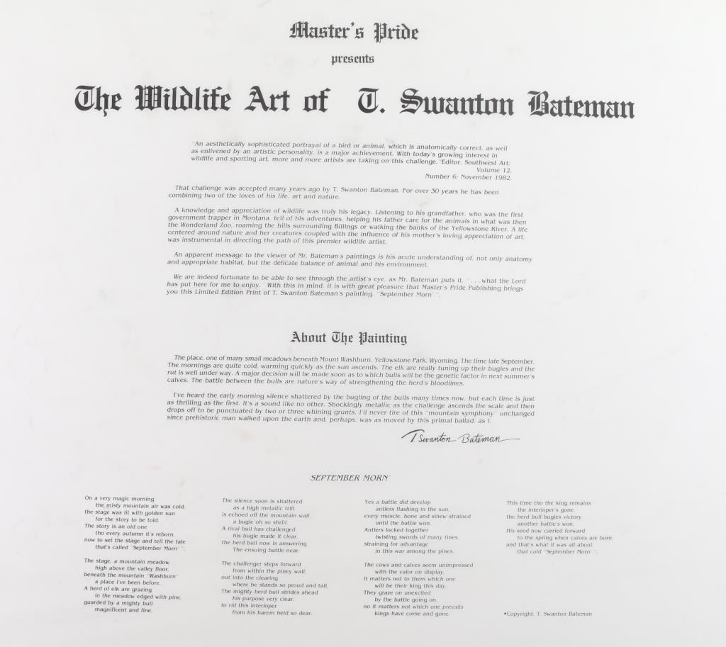By well known artist "T. Swanton Bateman" signed lower right, numbered lower left 401,415,430,442/950. All in good condition in art folio depicting deer in forest, all measuring 28x23. Also includes a print entitled "Sweet Grass buck, in good condtion by "Bateman"