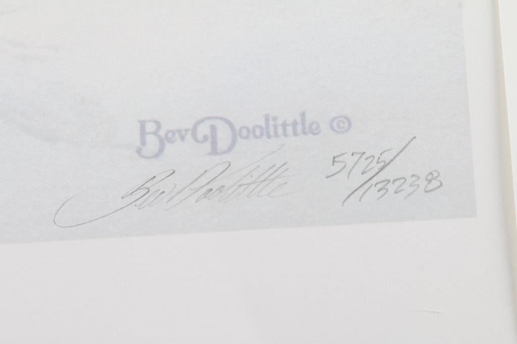 By Bev-Dolittle , entitled Guardian Spirit, numbered an signed (5725/13,228) measuring 27x26. Also included in this lot is a print by "Bev Do-Little" entitled "Season of The Eagles" numbered 17,308/36548. Measuring 31x22.5.