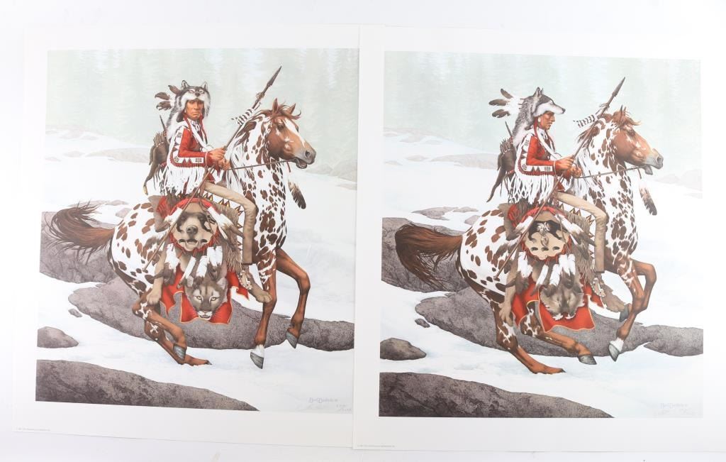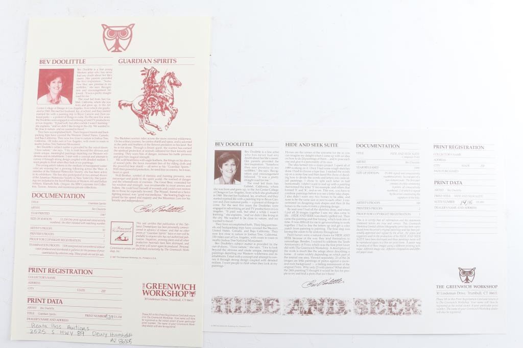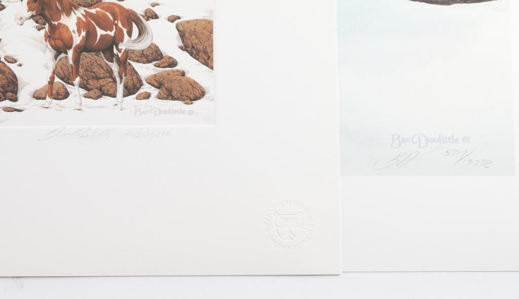 Both are by a profound artist of , "Bev-Dolittle", the first is a limited edition, entitled "Hide an Seek", signed and numbered 14,115/25,000 lower right, printed by Greenwich Workshop in 1990, measures 33x27 in perfect condition preserved in art folio. (1.) Bev-Dolittle, entitled "Guardian Sprits" signed and numbered lower right 5719/13,238, measuring 30x27.