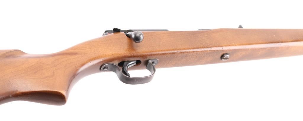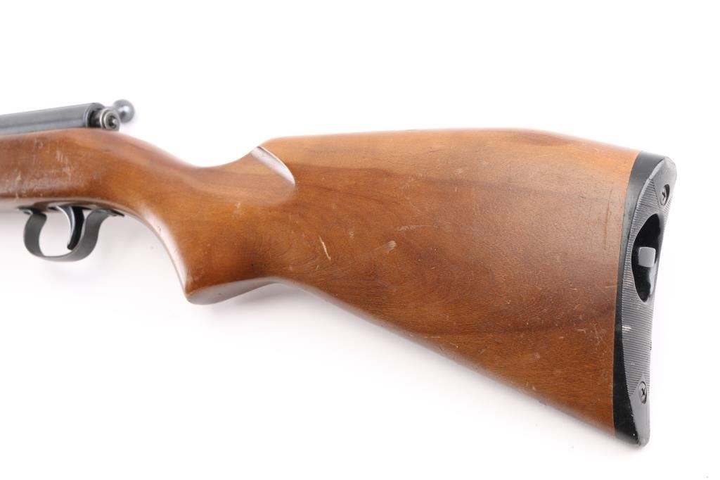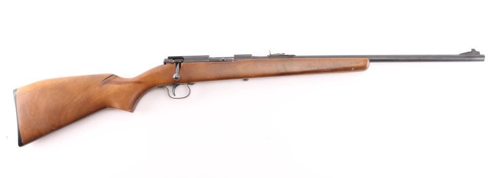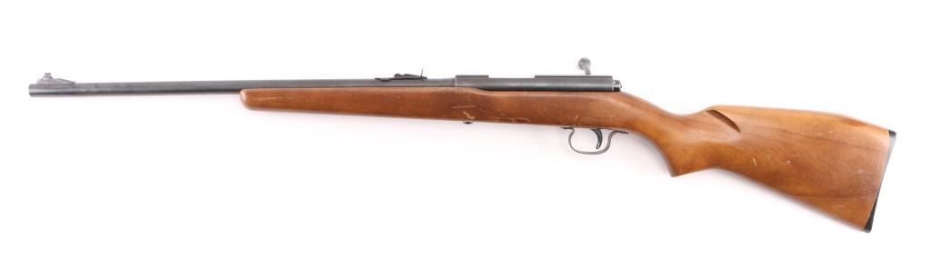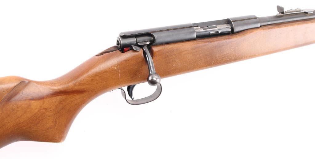 Bolt action rimfire buttstock tube magazine fed rifle chambered in .22 S/L?LR circa 1967. Features blued finish, wood stock with curved grip, serrated factory plastic buttplate and removable rear tube magazine rod. 25" barrel with serrated ramp blade beaded front sight, elevation adjustable sporting rear sight, manual push button safety. Retains 98% blue finish with very little edge wear, wood stock is very good with few dents, dings and shallow scratches. Bore and action are excellent. NRA Condition is Excellent. C&R firearm.