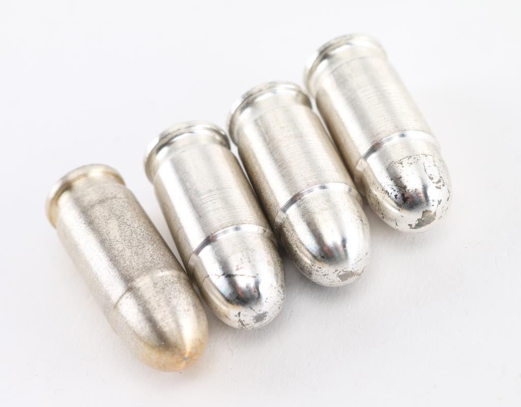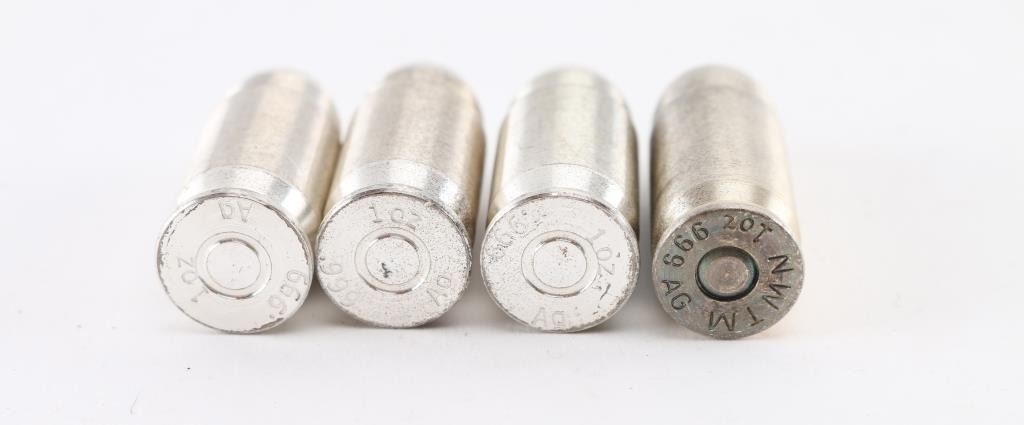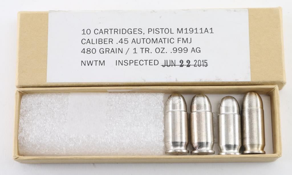 Four Silver . 45 Automatic FMJ 480 Grain / 1 Troy Ounce .999 AG Cartridges, A total of four .999 silver ounces of inert 1911A1 pistol cartridges, manufactured by Northwest Territorial Mint (NWTM), per their Mint Manufacturers Certificate of Authenticity, dated inspection Jun. 22, 2015