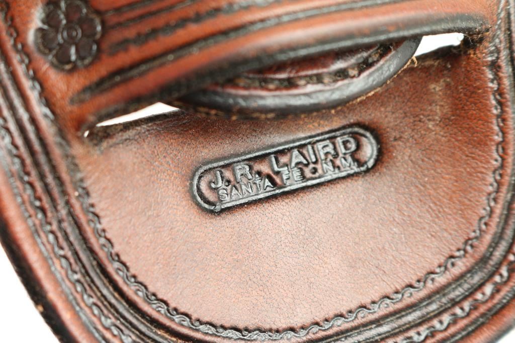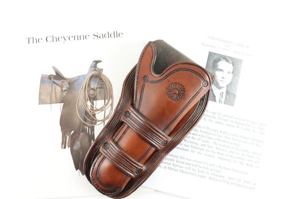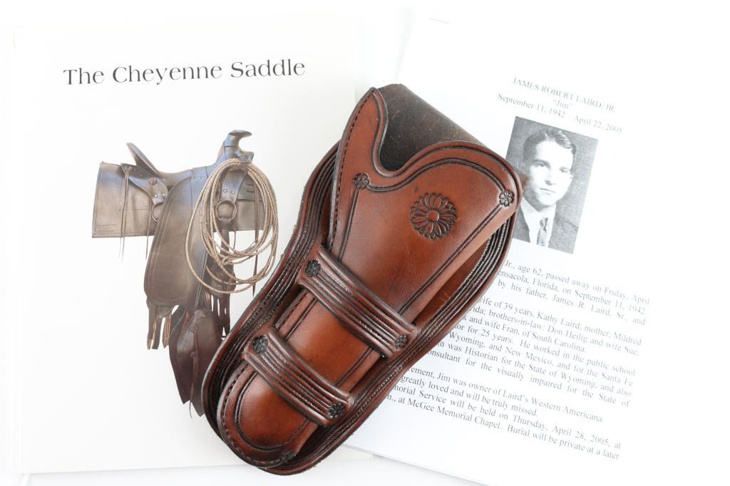 Authentic never used hand carved Jim Laird 'Cheyenne' holster and original pristine copy of his book the 'Cheyenne Saddle'. Holster will fit a 4 3/4" or 5 1/2' Colt Peacemaker. The maker's brand 'J.R. Laird, Santa Fe, NM., is hand carved under the inside toe of the holster. 'The Cheyenne Saddle', is a historical study of numerous leather craftsman from Cheyenne Wyoming during the late 1880's. Jim Laird's signature is on page 2 of his book. A copy of Jim Laird's obituary and widows letter, is enclosed with the book