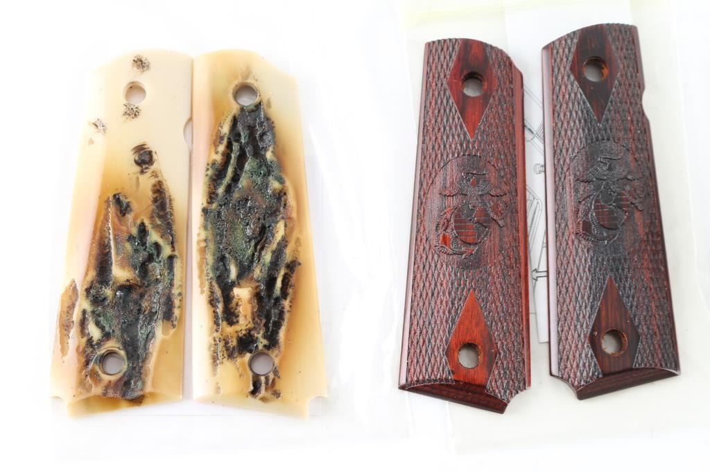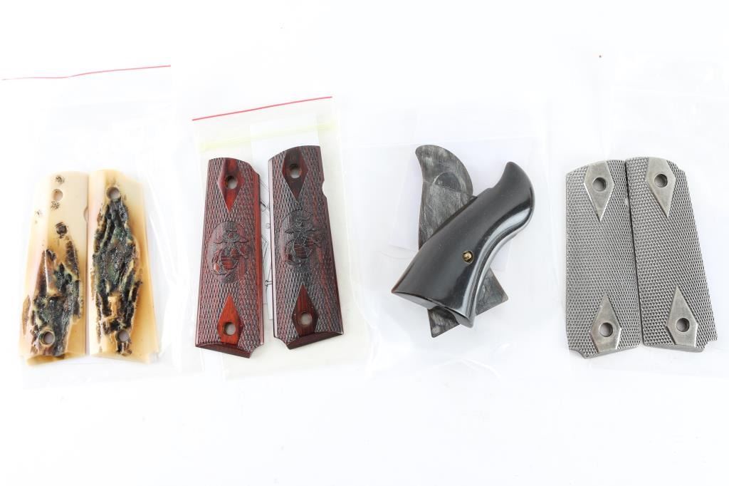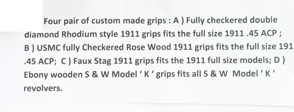 4 Pair of Custom made Grips. Fully checkered diamond Rhodium style 1911 grips for full sie 1911 45 ACP. USMC fully checkered Rose Wood 1911 grips for full size 1911 45ACP. Faux Stag 1911 grips for 1911 full size 45 ACP. Ebony wooden S&W model 'K' grips for all S&W models 'K' revolvers.