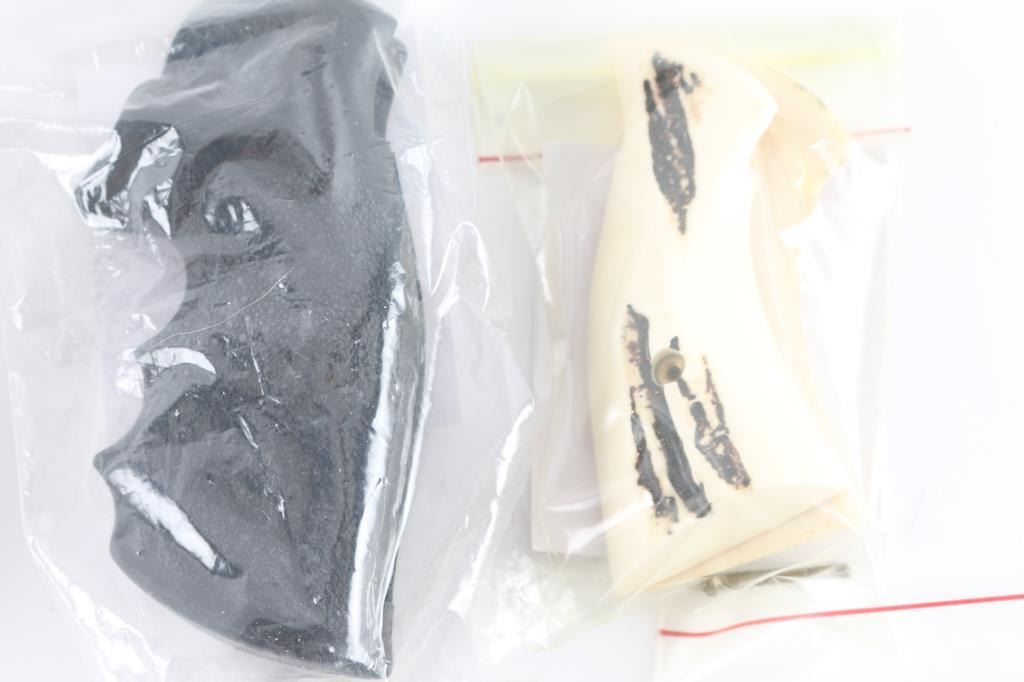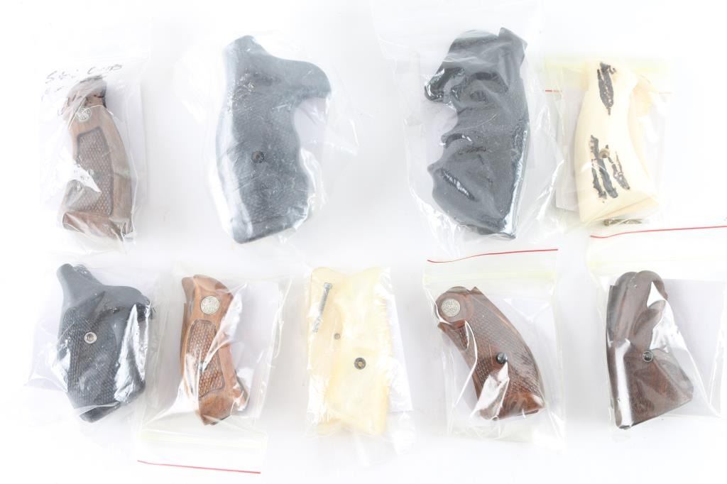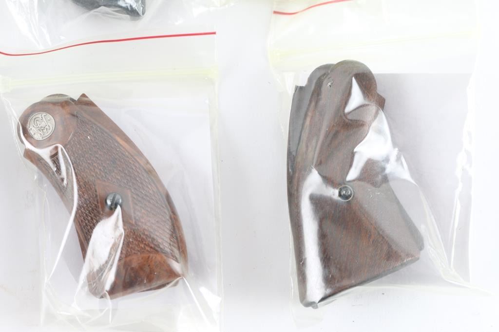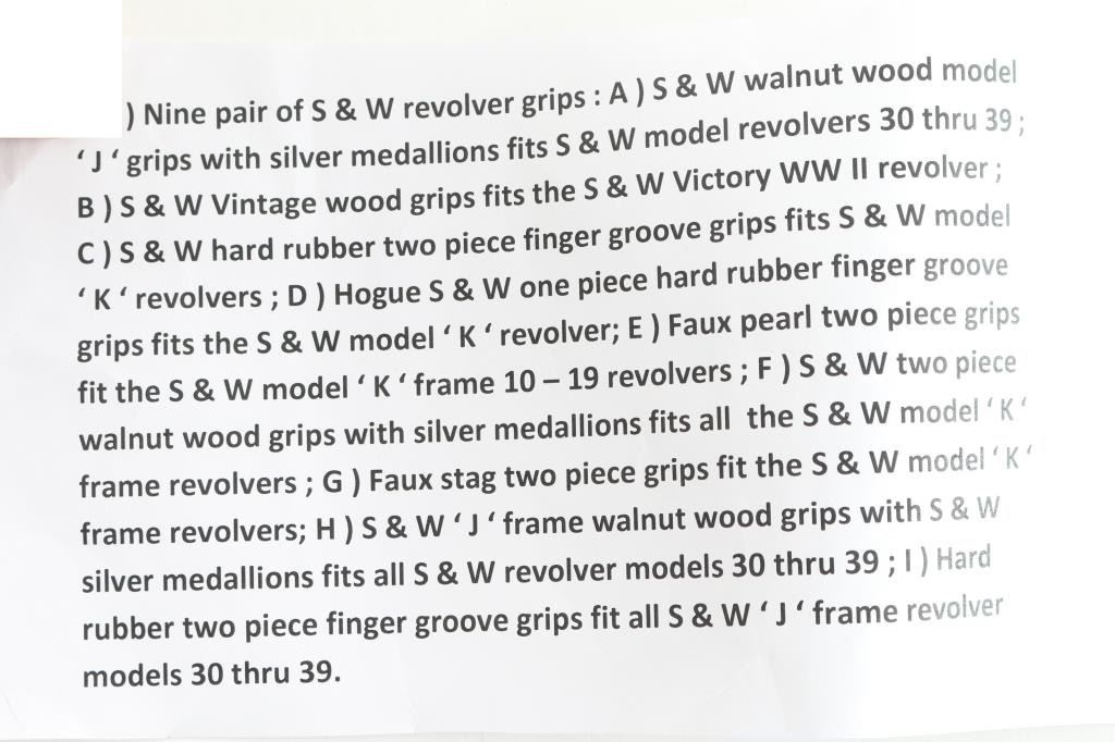 9 Pair S&W Revolver Grips- J frame Silver medallions walnut grips for 30 thru 39 revolvers. Vintage wooden WW II Victory revolver. Hard rubber 2 piece finger groove grips for 'K' model revolvers. Hogue 1 piece hard rubber finger groove for model 'K' revolvers. Faux pearl 2 piece grips for 'K' frame 10-19 revolvers, 2 piece walnut wood grips with silver medallions for all 'K' frame revolvers. 'J' frame walnut wood grips with silver medallions for models 30-39. Hard rubber 2 piece finger groove grips for S&W 'J' frame revolvers 30-39.
