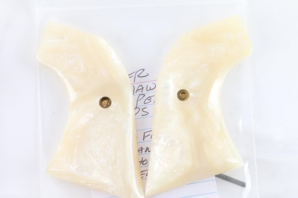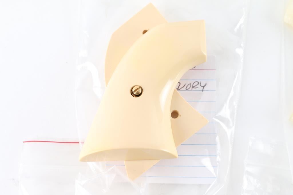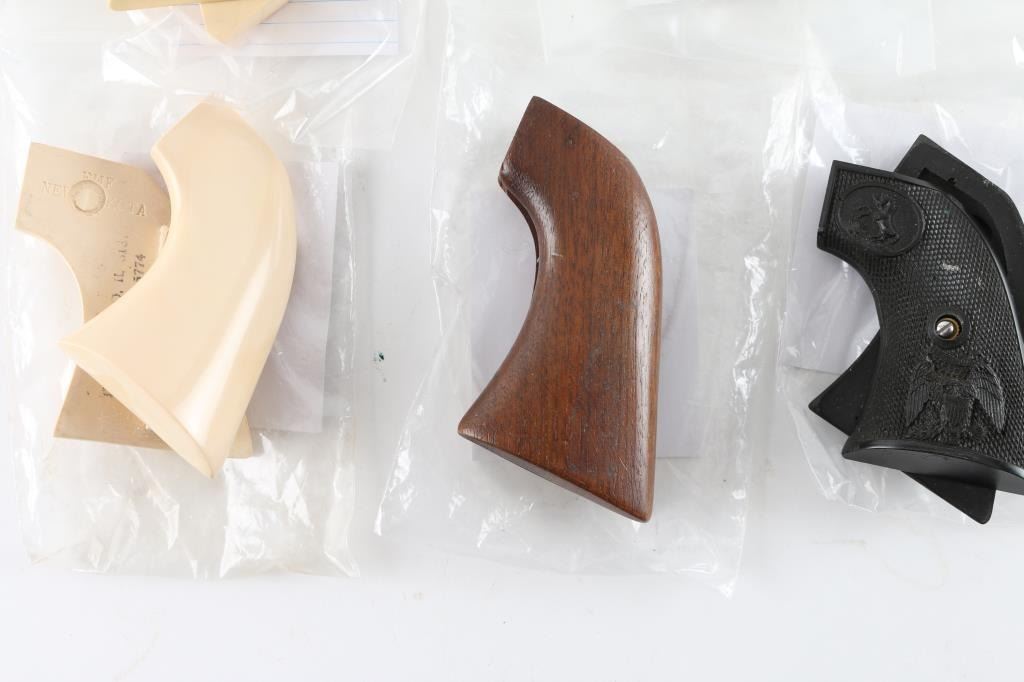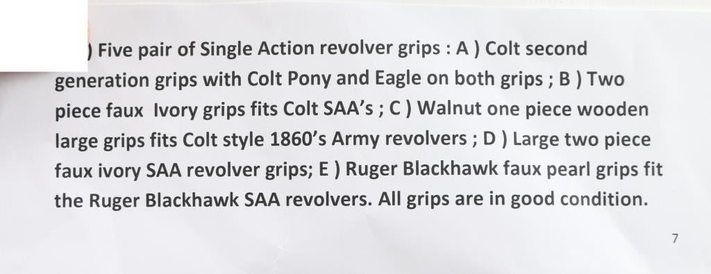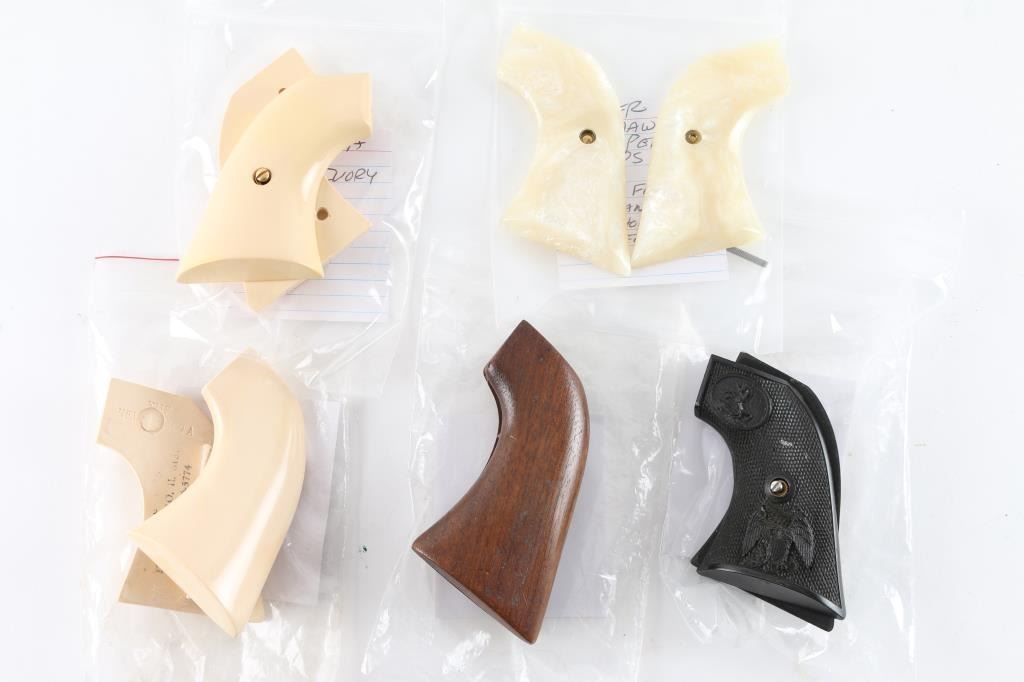 5 Pair of Single Action Revolver Grips- Colt 2nd generation grips with Colt Pony and Eagle on both grips. 2 piece faux ivory grips fits Colt SAA's Walnut 1 piece wooden large grips fits Colt style 1860's Army revolvers. Large 2 piece faux ivory SAA revolver grips. Ruger Blackhawk faux pearl grips fit Blavkhawk SAA revolver. All grips are in good condition.