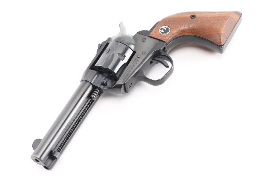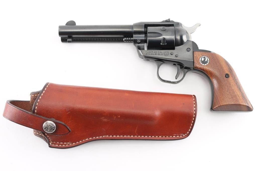 "Old Model, Three-Screw' single action 6 shot revolver. Features blued finish, smooth wood grips with Ruger medallions, 4.5" barrel, fixed sights, fluted cylinder. Bore & charge holes are excellent. Retains 96% blue with minor edge wear, and scratches, and minor track lines on the cylinder. Grips are excellent condition. Action is smooth with tight lock-up. Comes with a Bianchi brown leather snap holster, very good condition. NRA Condition-Very Good. Modern Firearm.