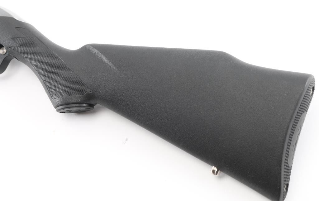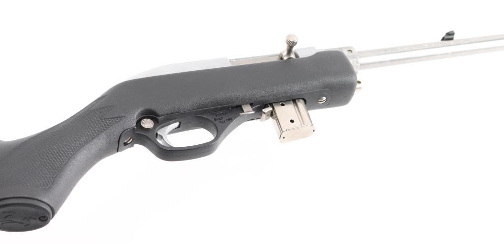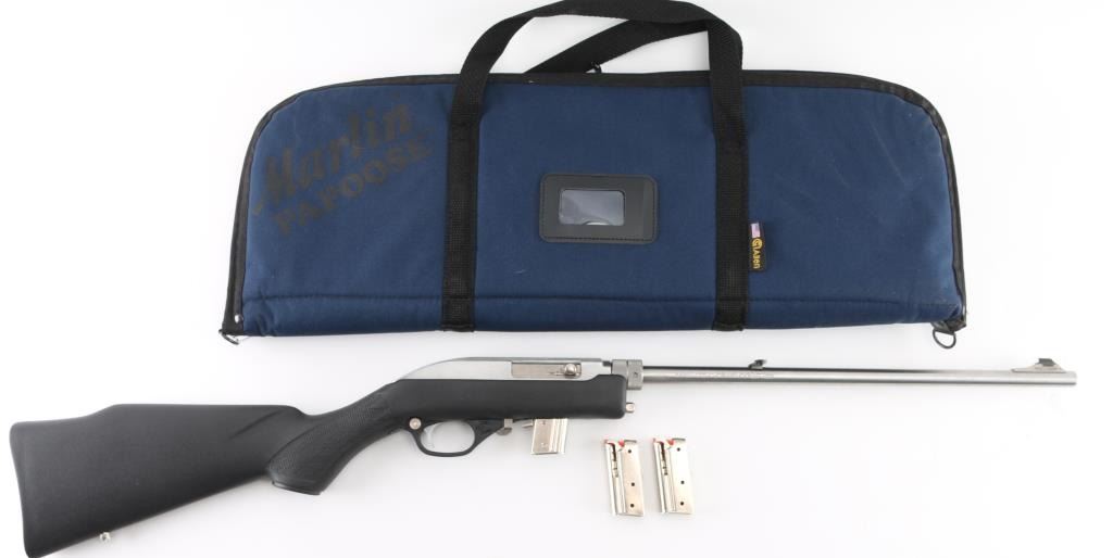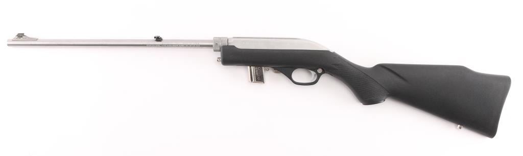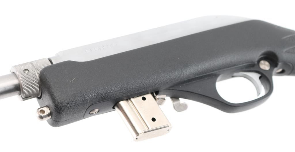 The "Papoose", light weight survival rifle. Nickel-plated auto-loading; side ejection; automatic “last-shot” bolt hold-open; manual bolt hold-open; cross-bolt safety. 16 1/4" stainless steel barrel with Micro-Groove rifling (16 grooves) Twist Rate: 1:16" Monte Carlo black fiberglass-filled synthetic with abbreviated fore-end, nickel-plated swivel studs and molded-in checkering. Comes with padded case with built-in flotation. and 3 7-rd magazines. Like new condition. NRA Condition-Excellent. Modern Firearm.