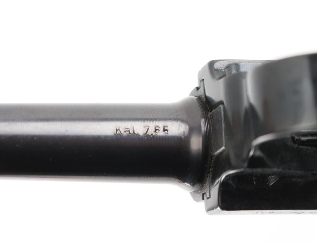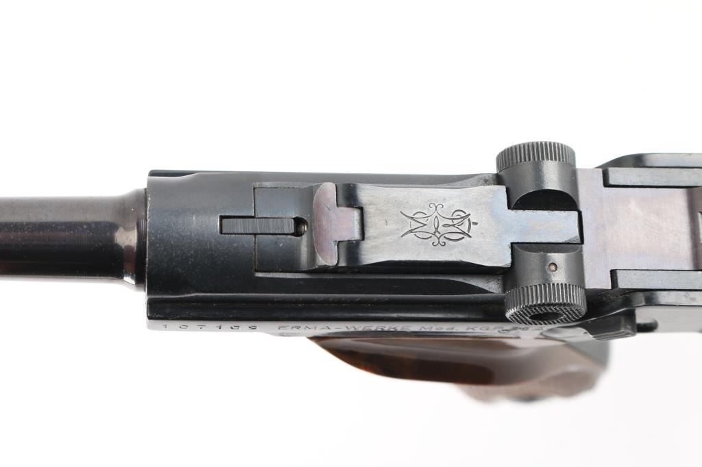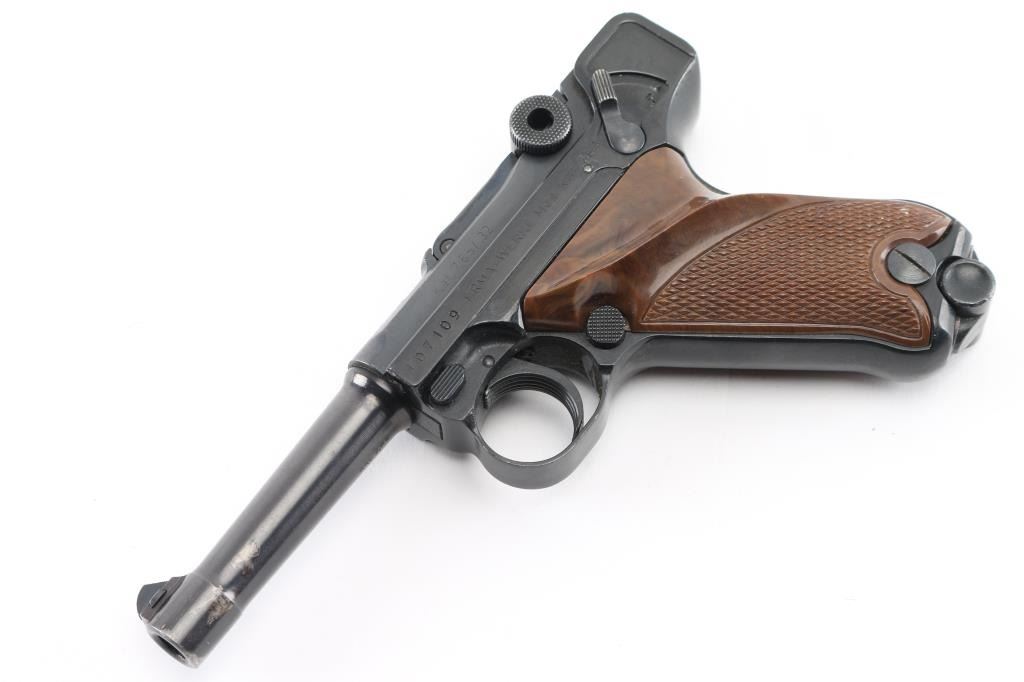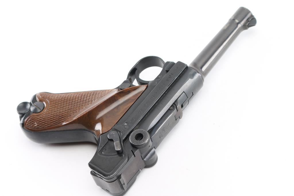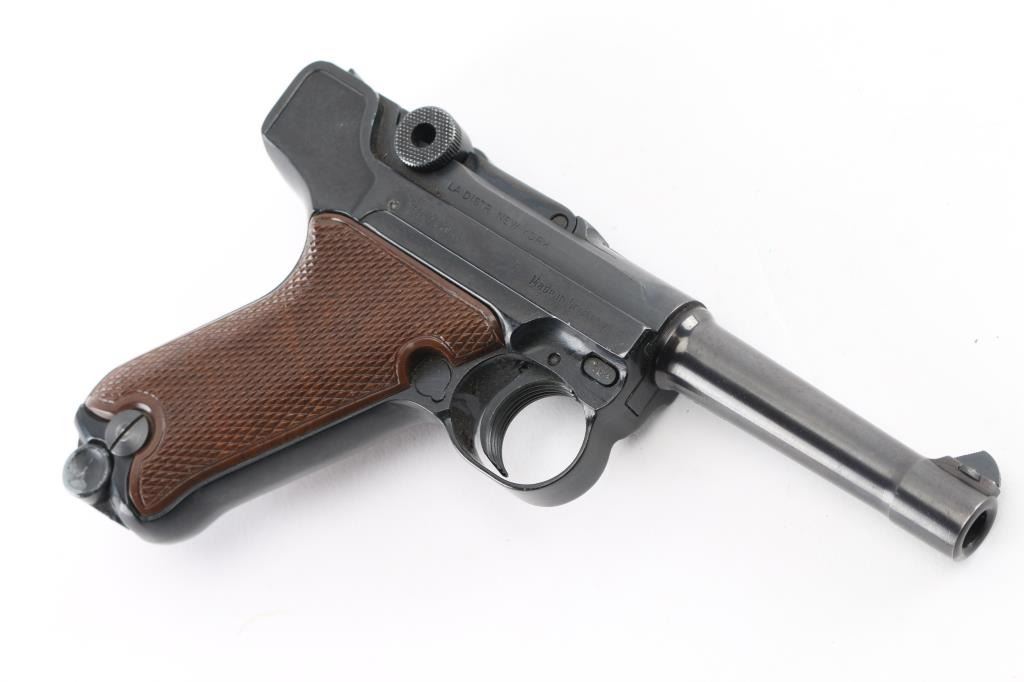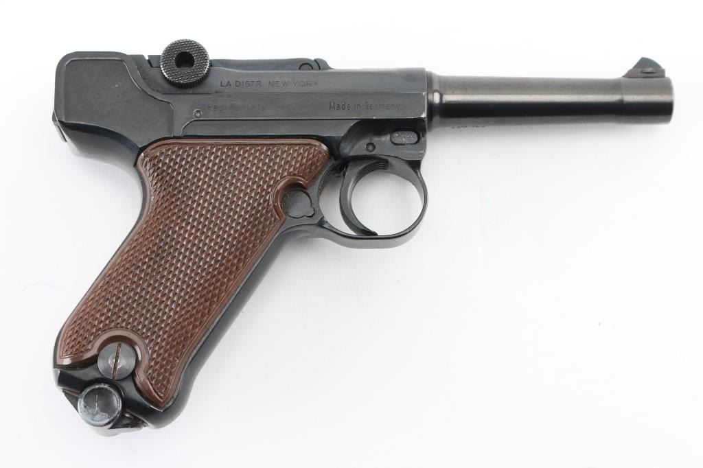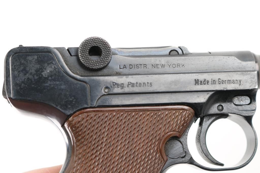 Semiautomatic pistol made in Germany, imported by LA DISTR, NY. Has the appearance of an approx 3/4 scale Luger. Features blued finish, checkered brown plastic faux wood grips with thumb rest on left panel, manual safety, fixed sights, 3.5" barrel. Bore is very good. Retains 90% finish with handling marks, discoloration on barrel. Grips are excellent. Includes one magazine. Condition is near NRA Excellent *** Modern Firearm ***