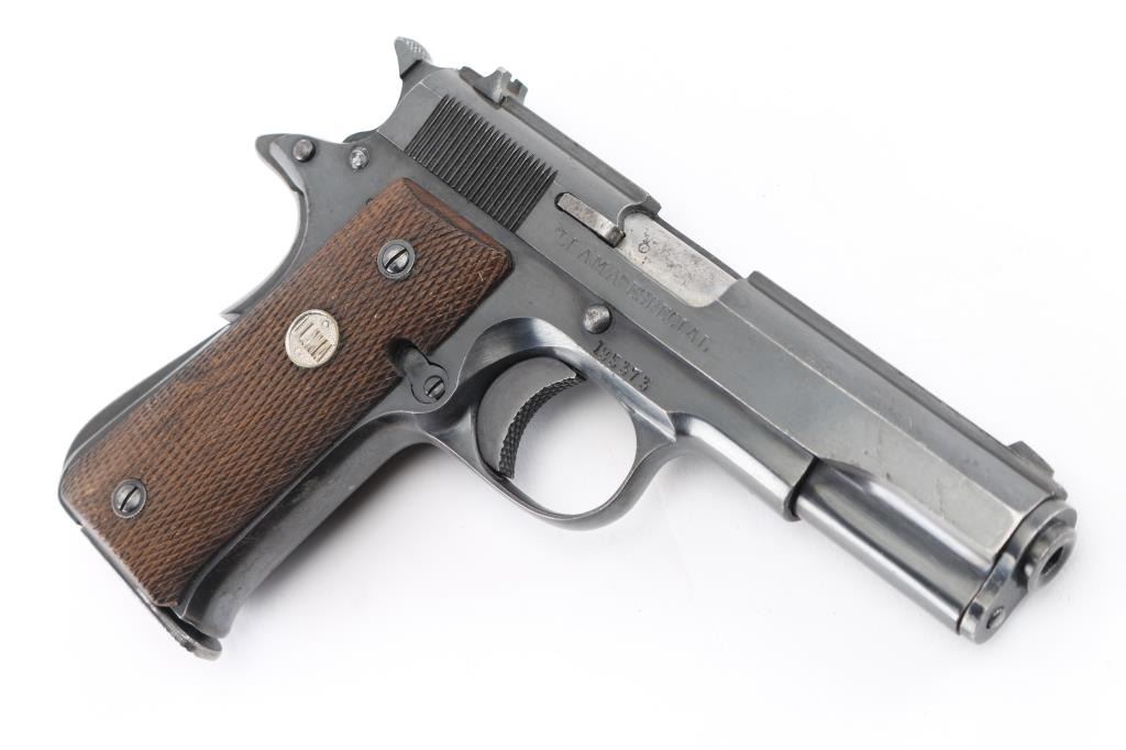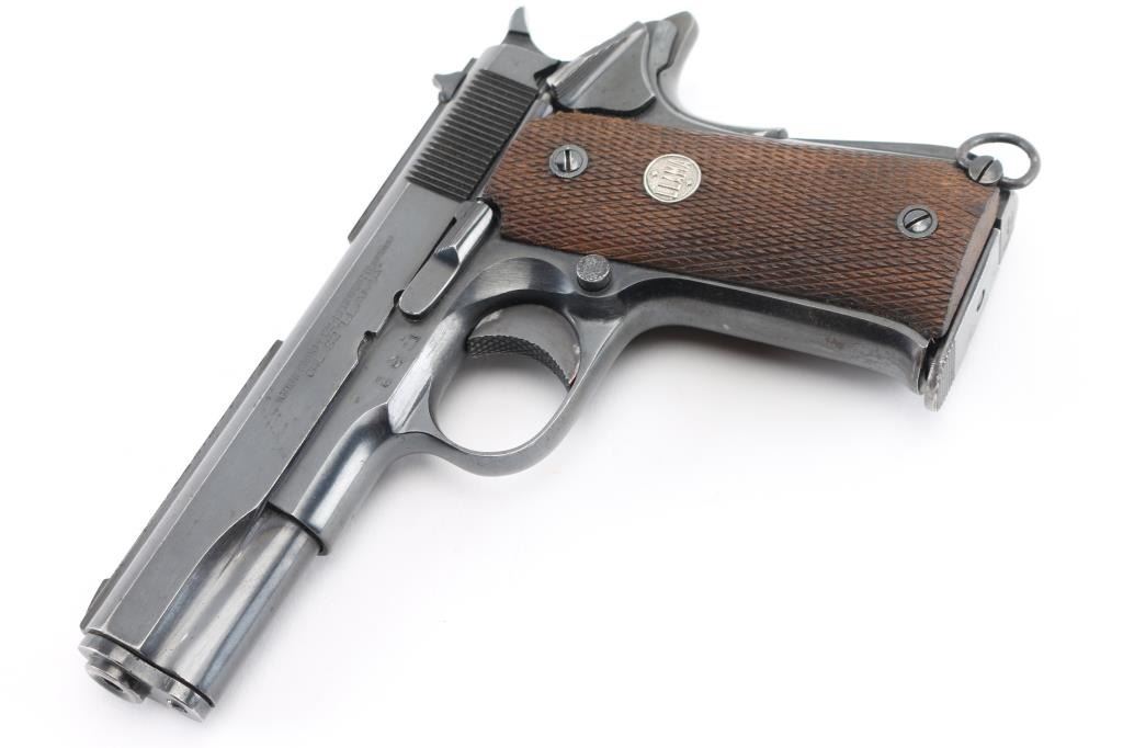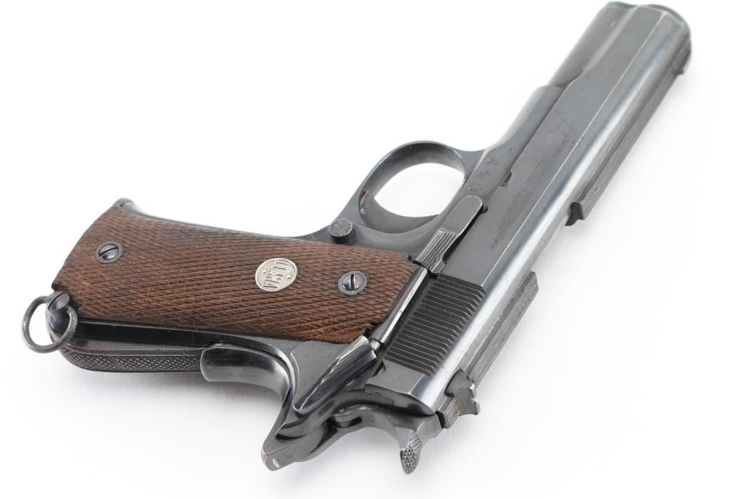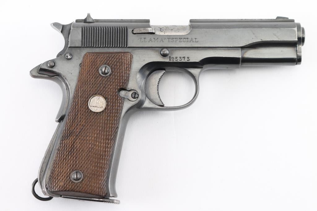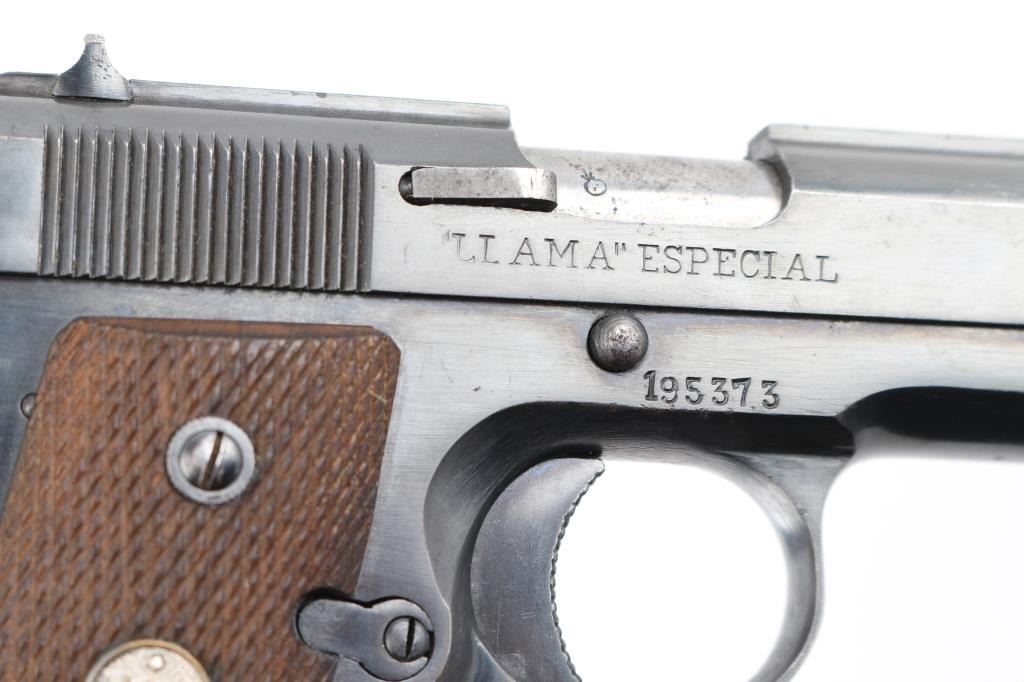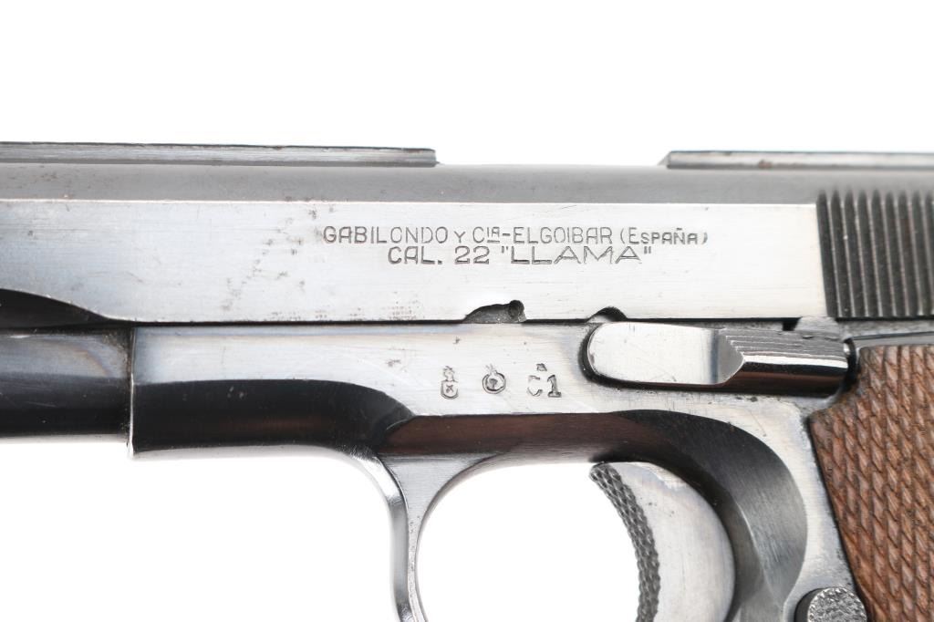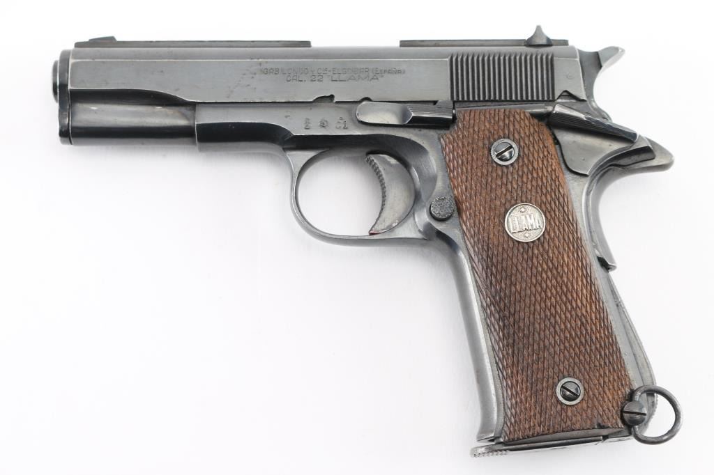 Spanish semiautomatic rimfire pistol, date coded 1957. Features blued finish, checkered wood grips with "LLAMA" medallions, single action trigger, 3.75" barrel, blade front sight, notch rear sight in dovetail, frame mounted manual safety, grip safety, lanyard ring. Bore is very good condition. Retains 90% dark blue with small scratches, bare metal at sharp edges. Grips are very good condition. Includes one magazine. Condition is near NRA Excellent *** C&R Firearm ***