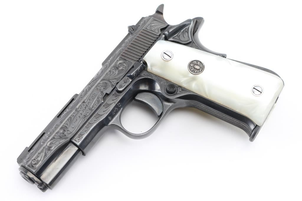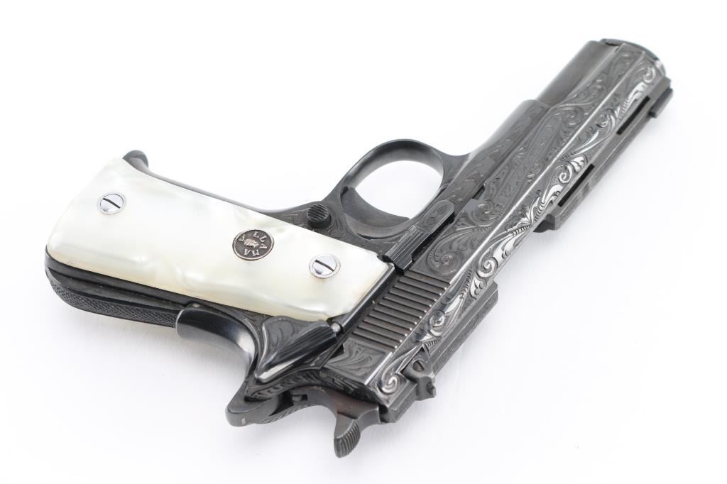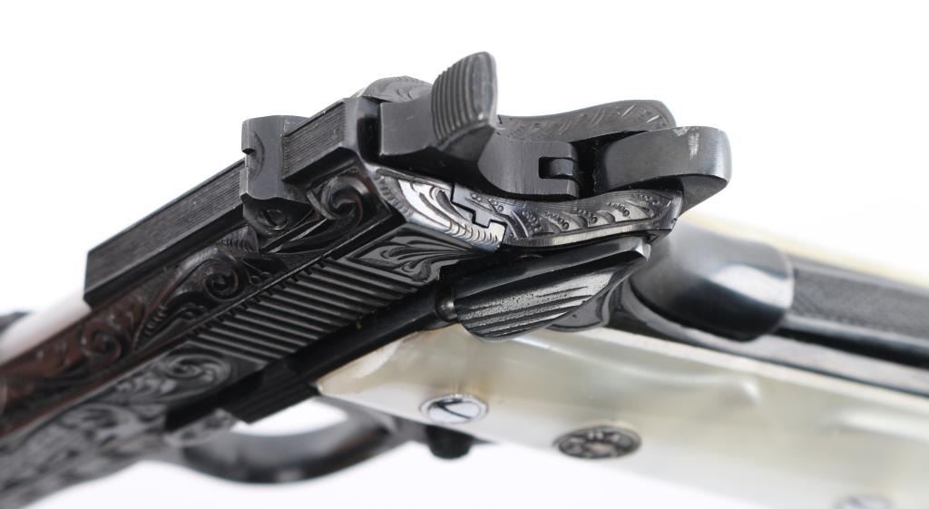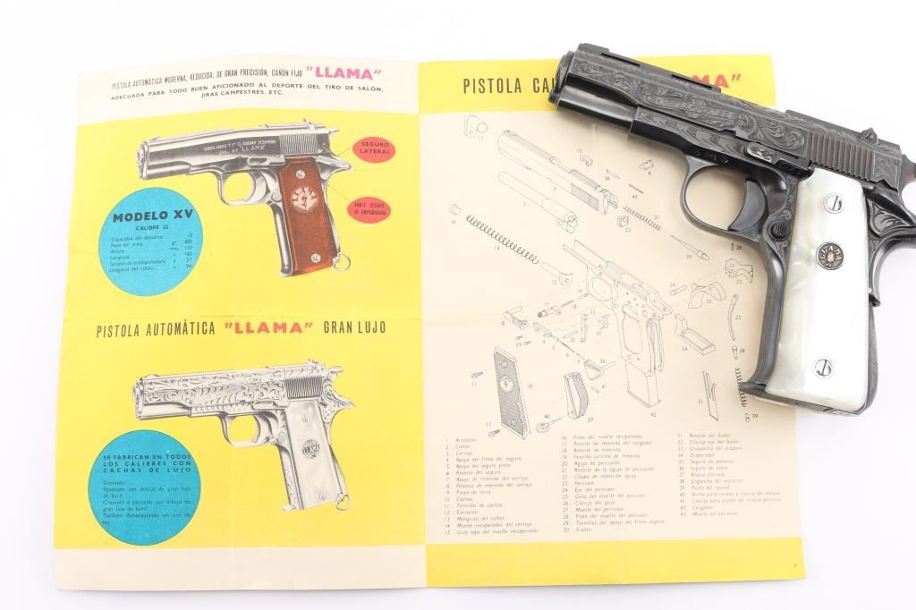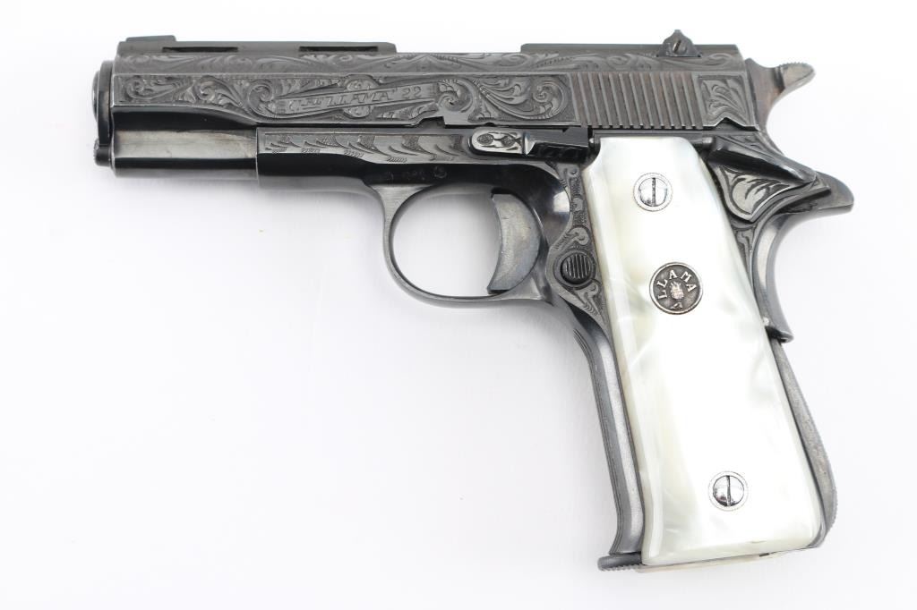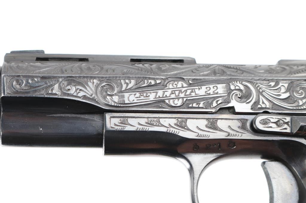 Deluxe Engraved semiautomatic rimfire pistol, made in Spain, date coded 1973. Features scroll engraving on 75% of slide, blued finish, smooth faux pearl polymer grips with Llama medallions, 3-5/8" barrel, blade front & windage adjustable rear sights set in raised ventilated rib, single action, thumb & grip safeties, push button magazine release. Bore is excellent. Retains 98% finish with minor handling marks. Grips are excellent overall with small scratches. Includes one magazine, full color factory advertising pamphlet. Condition is NRA Excellent *** Modern Firearm ***