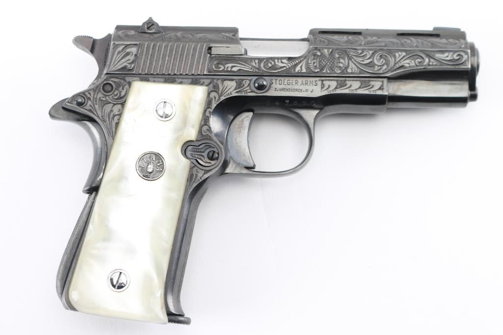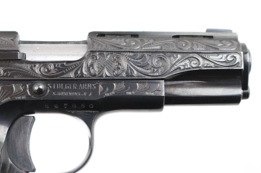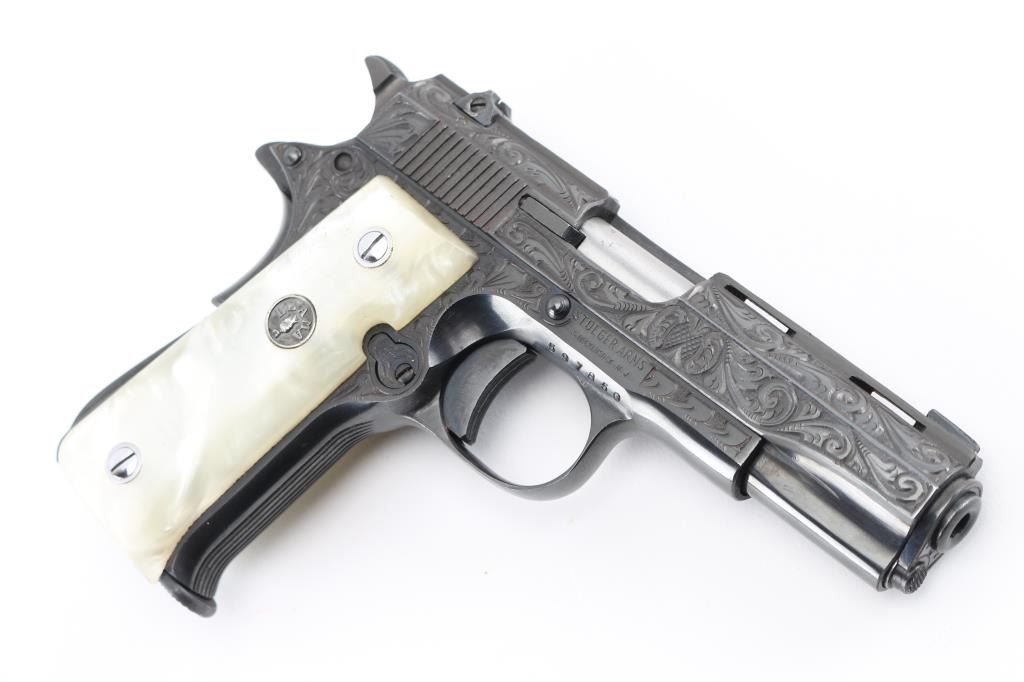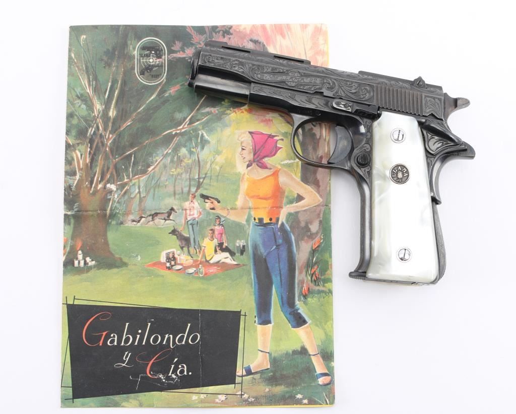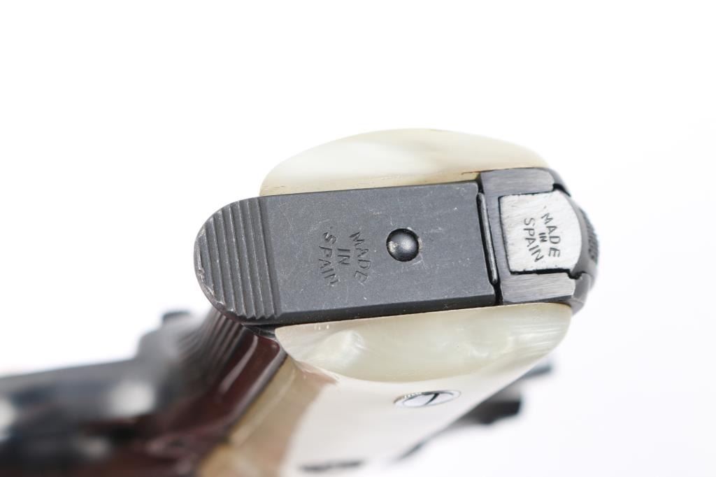 Deluxe Engraved semiautomatic rimfire pistol, made in Spain, date coded 1973. Features scroll engraving on 75% of slide, blued finish, smooth faux pearl polymer grips with Llama medallions, 3-5/8" barrel, blade front & windage adjustable rear sights set in raised ventilated rib, single action, thumb & grip safeties, push button magazine release. Bore is excellent. Retains 98% finish with minor handling marks. Grips are excellent overall with small scratches. Includes one magazine, full color factory advertising pamphlet. Condition is NRA Excellent *** Modern Firearm ***
