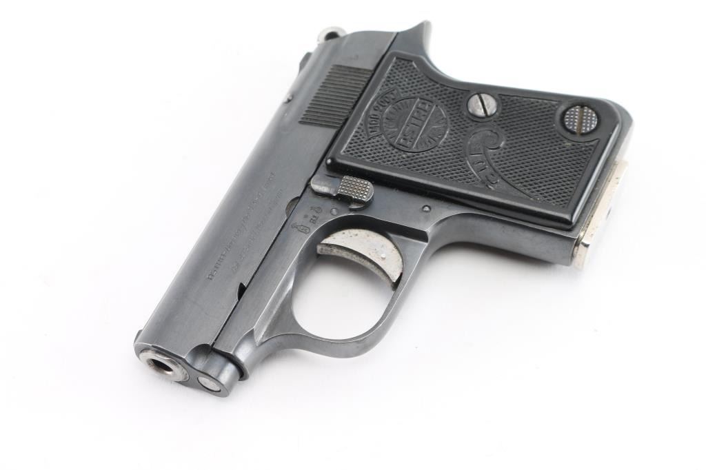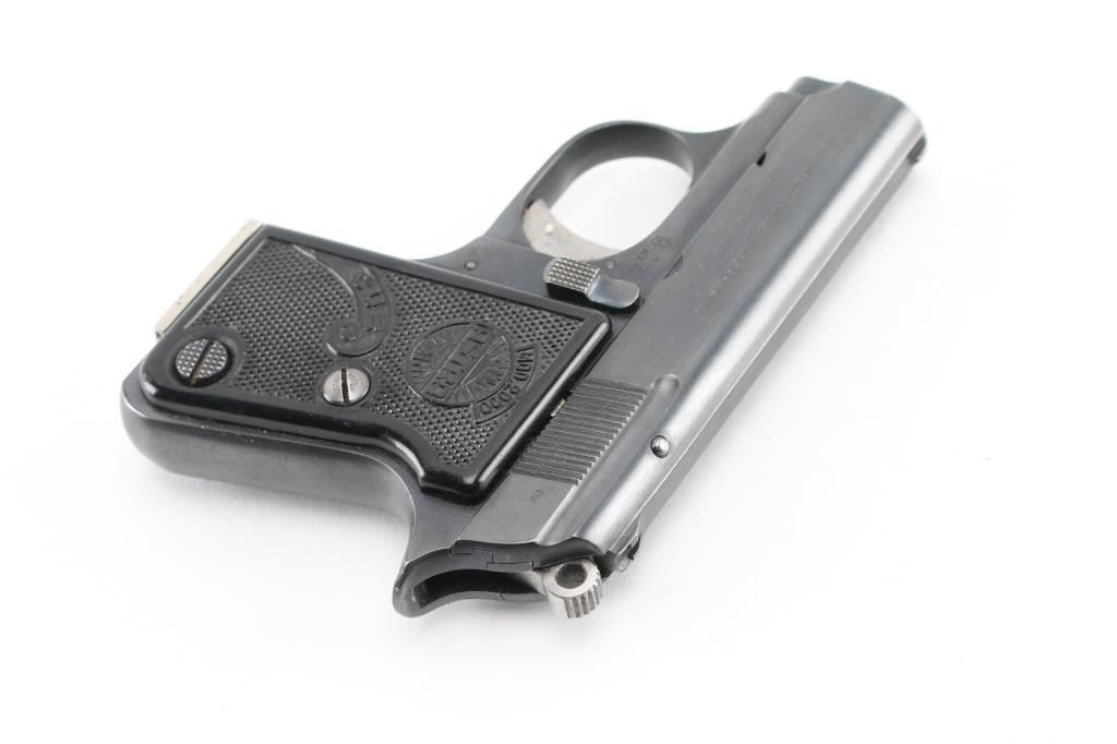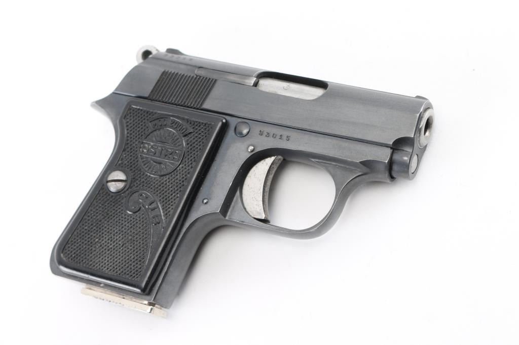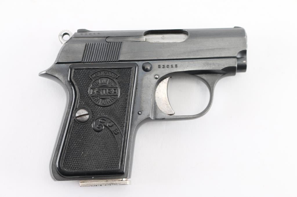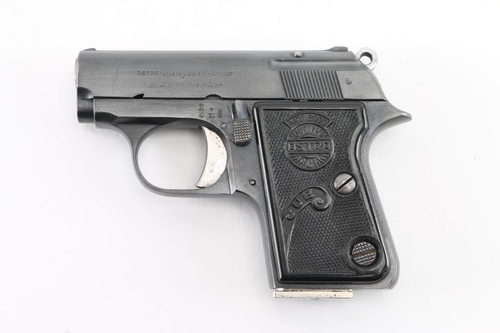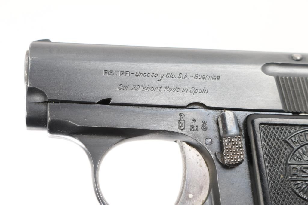 Vintage single action semi-automatic pocket pistol chambered in .22 Short, manufactured in Spain circa 1956. Features a blued finish, 2.25” barrel, full-length steel guide rod, fixed sights, smooth trigger, serrated round hammer spur, manual safety/slide catch on the left side of the frame, push button magazine release on side near heel, 5 round magazine, steel frame and two-piece checkered black plastic grips with molded Astra insignias. Matching serial numbers are found on the frame & slide. Pistol retains approximately 90% of its original finish showing handling marks and light edge losses. Grips are very good. Includes one magazine. Condition is NRA Very Good++ *** C&R Firearm ***