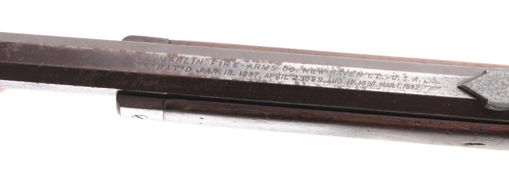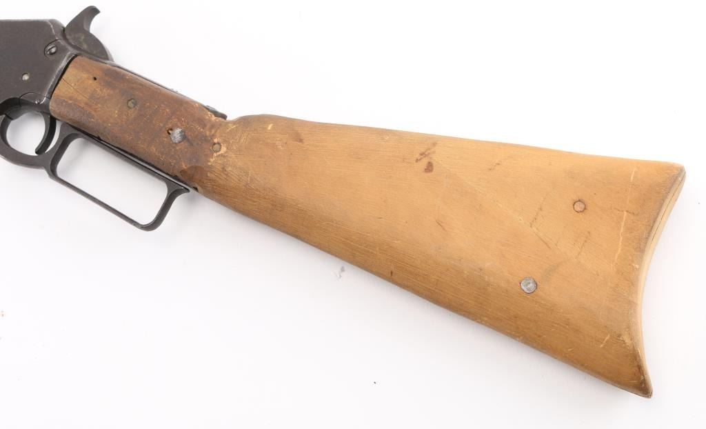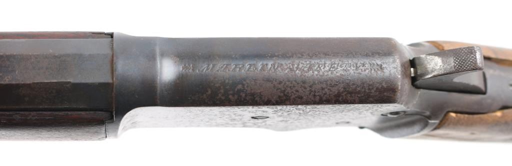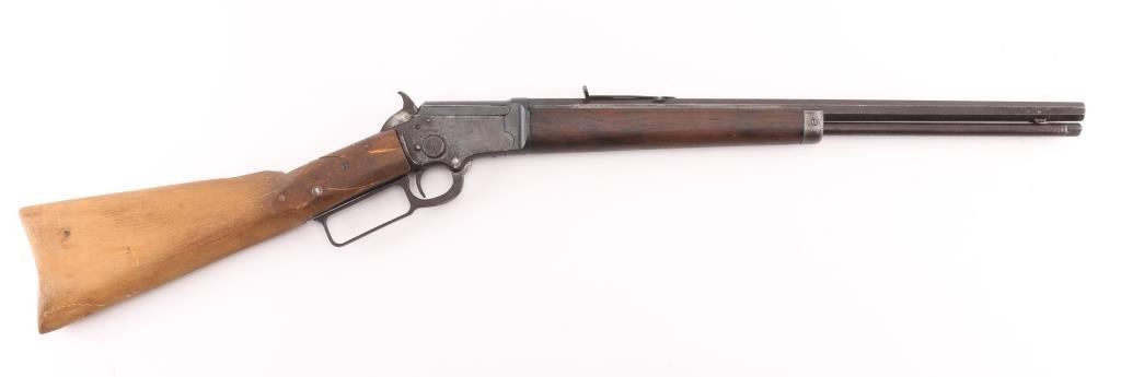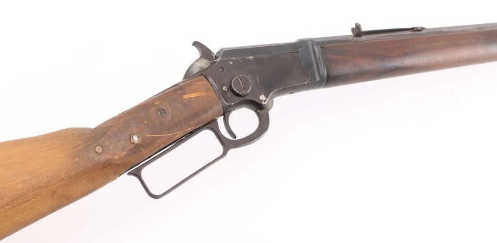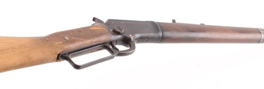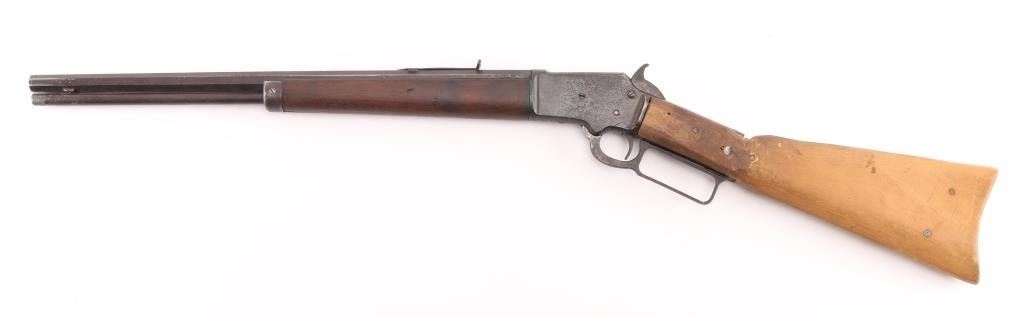 Vintage tube fed lever action, take-down, "Marlin Safety" rifle. Octagonal barrel has been shortened to 17 1/2", so no front sight, sporting rear sight. Bore is rough/dark, forearm with metal cap is very good, buttstock is a handmade replacement, poor, cracked, loose, Action works well, blue finish is poor, scattered pin-prick pitting throughout. Parts/project gun. Manufactured 1900. Condition-Poor. C&R Firearm,