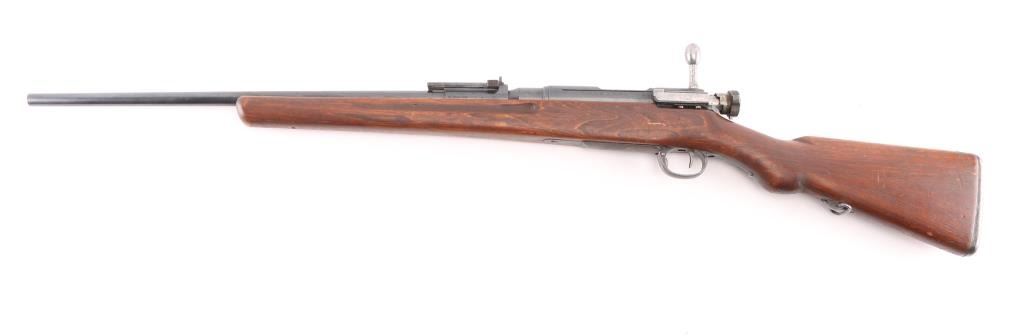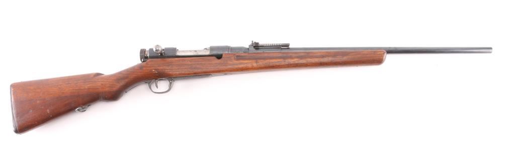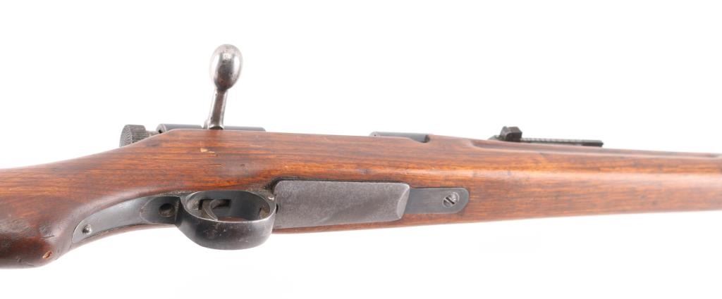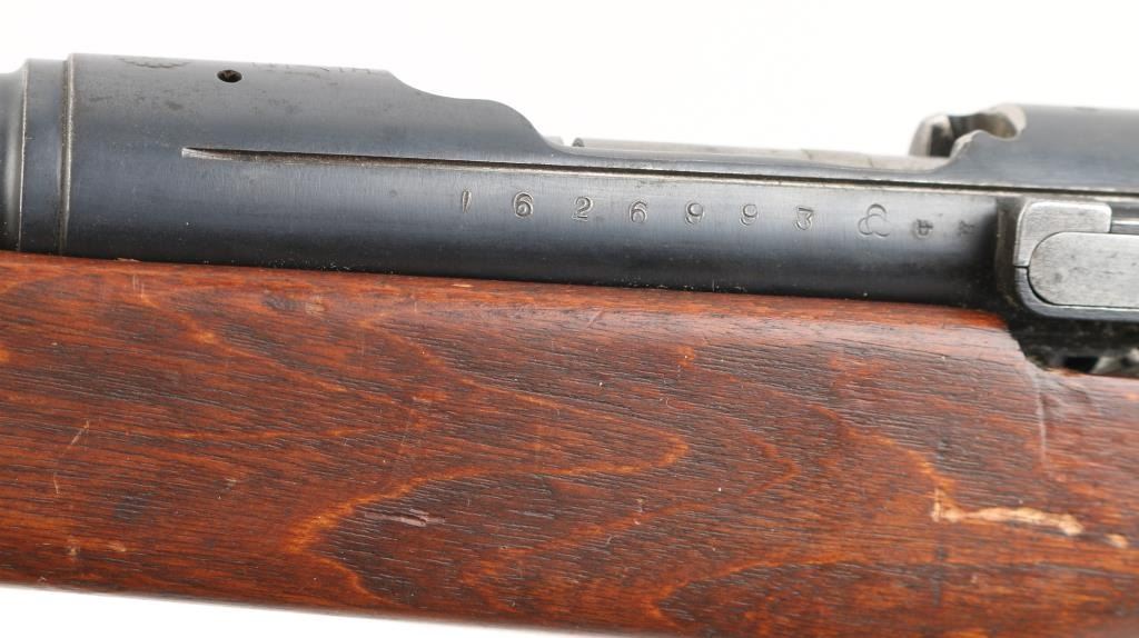 NOTE* Parts/project gun. Sporterized military rifle features polished & reblued finish, 24" shortened barrel, no front sight, original stock with forend shortened & rounded at tip, original rear sling swivel retained, no front swivel. Intact Mum. Bore is fair condition, dark with strong rifling. Retains 96% reblue, some edge losses. Stock has been sanded, with rounded edges on grasping grooves, fair fit to buttplate. Mum and type marking retained, slightly eroded from polishing, no other markings observed. Barrel appears to be original barrel, shortened with original rear sights. Must be checked by a gunsmith to verify chambering. Appears to be older vintage sporterization, probably in 1950's. receiver is not flush with the tang, so it sits to high, therefore it will not fire when charged, Needs adjustment, or part it out, Condition is Inoperable/Needs Repair. C&R firearm